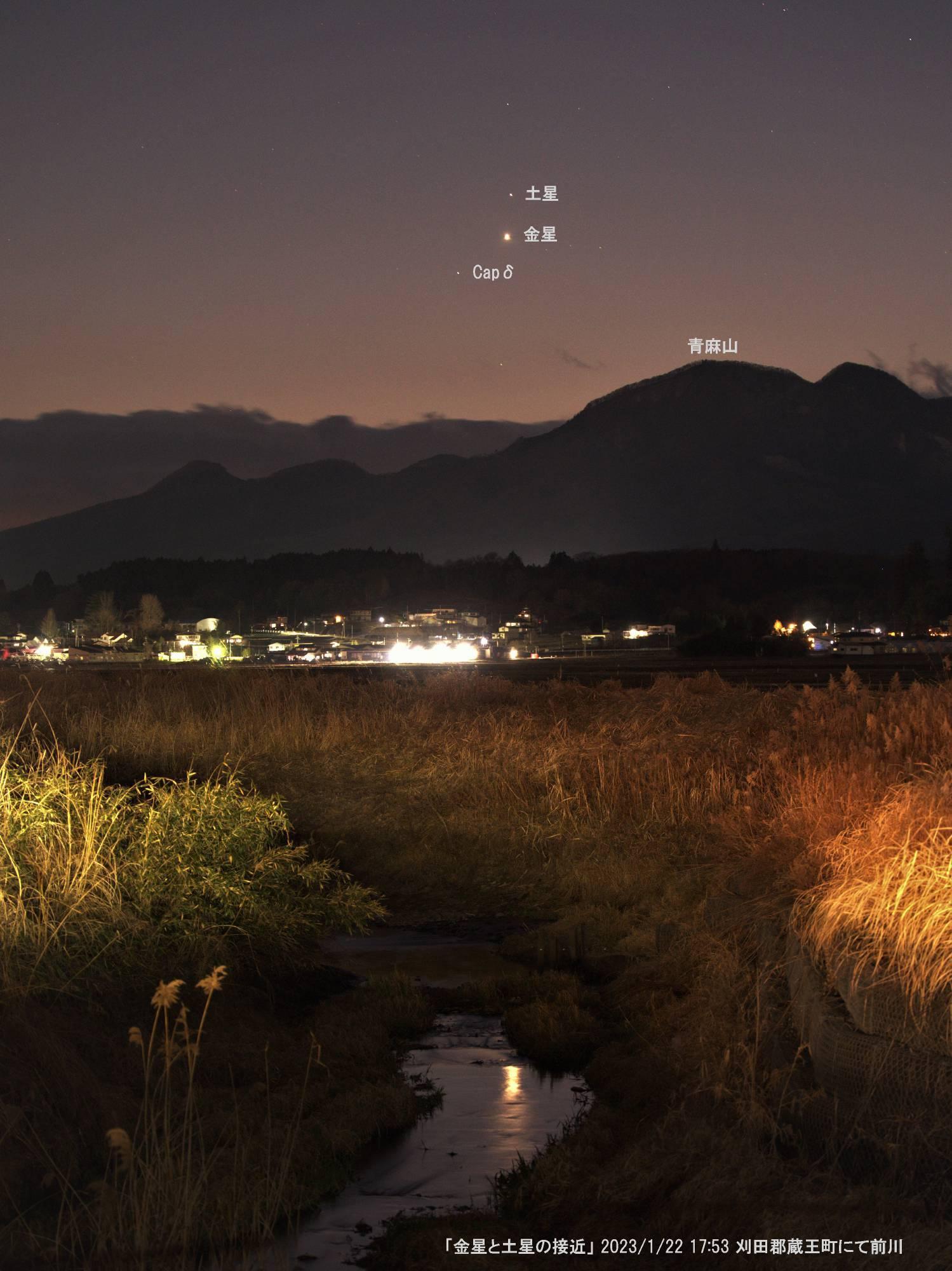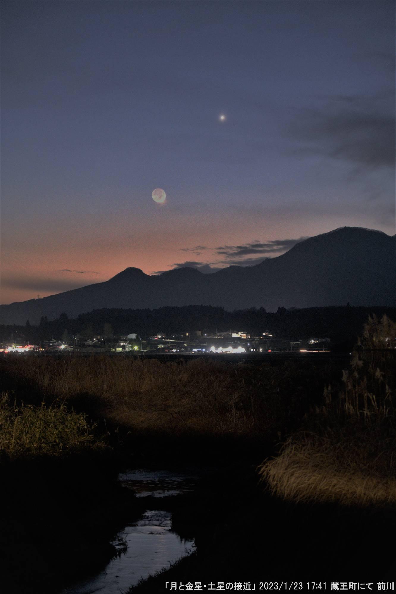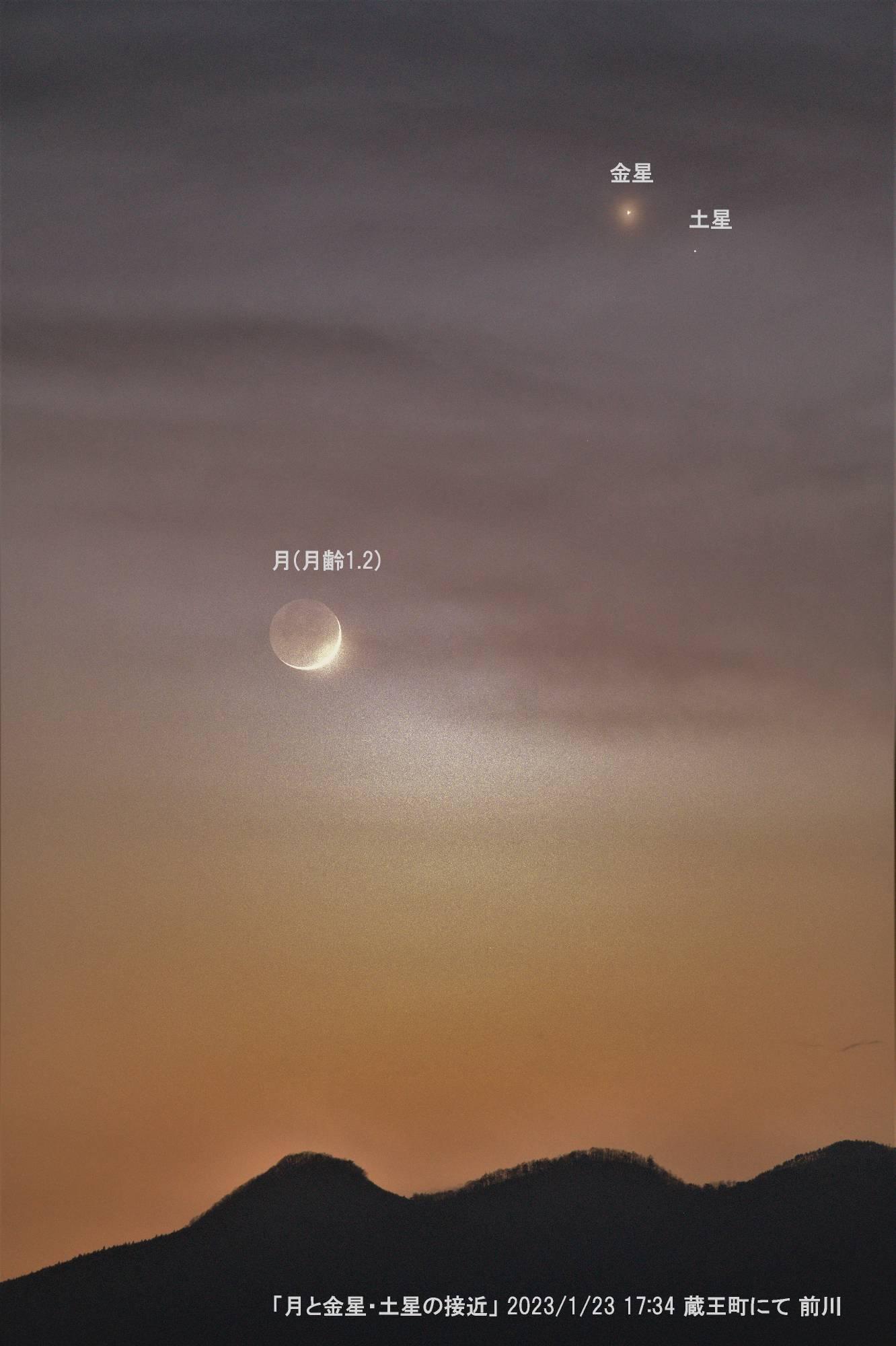 2023/01/22 最近金星が見えるようになり,土星と並ぶようになりました。そして,22日は土星の下に金星が並び,23日は金星の下に土星が最接近(約1度弱)し,その左下に月齢1.2の月が並んで見えます。