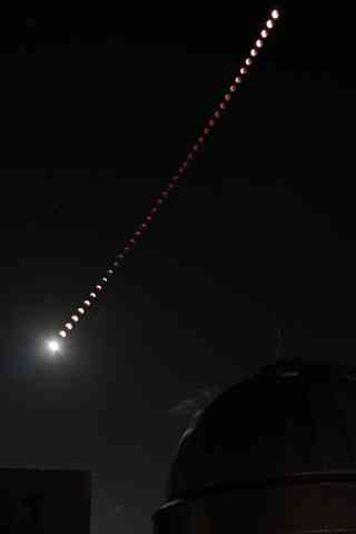 食中の夜空の明るさ変化を調べようと円形魚眼レンズで月食中に撮影していました。