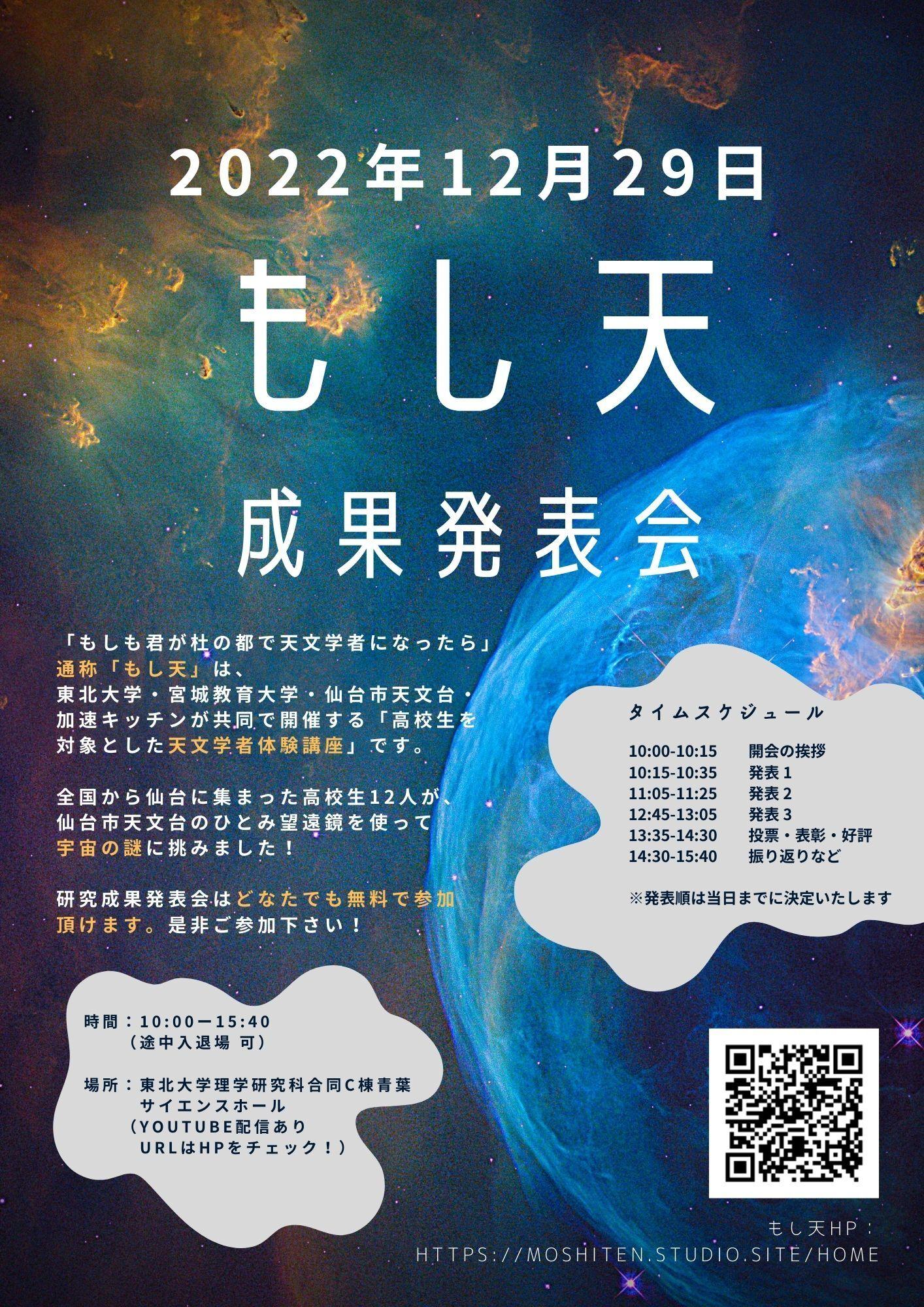 1週間の研究の成果発表会を、12 月 29 日 10 時より行います! 東北大学理学研究科合同 C 棟⻘葉サイエンスホールでの対面開催(無料、途中入退場可)に加え、 YouTube 配信も行います。ぜひお越しください!
