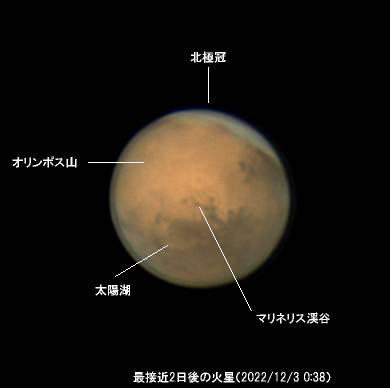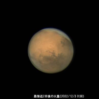 「最接近2日後の火星」 2022/12/3 0:38 機材C11(直径280㎜ f2800㎜)+2×バロー +IRカットフィルター+ASI290MC撮像
