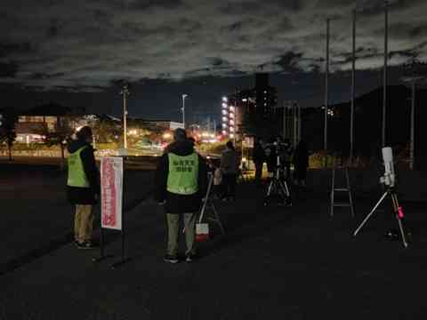 屈折望遠鏡3台、大型双眼鏡、小型双眼鏡を4人で操作、呼び込み等のサポート2名の計6名での対応です。
