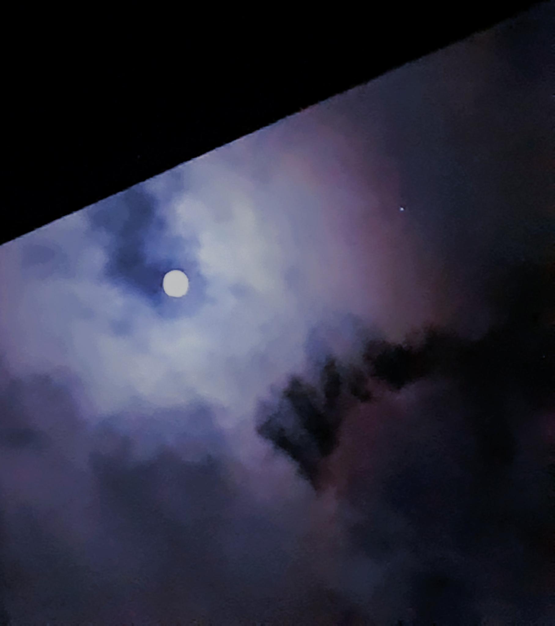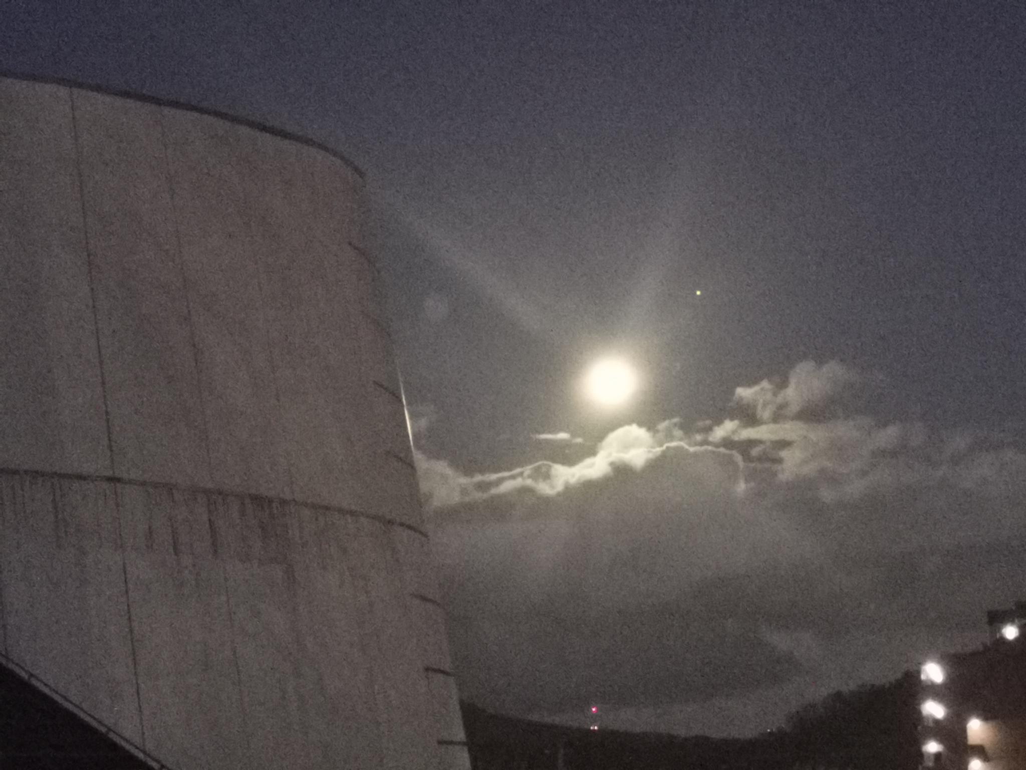 満月と火星の接近が見られました。私が空を見上げたときは曇り空で,すき間から見えたときにスマホから撮影しました。タイミングを合わせるのがたいへんで,たくさん撮影した中からの1枚です。