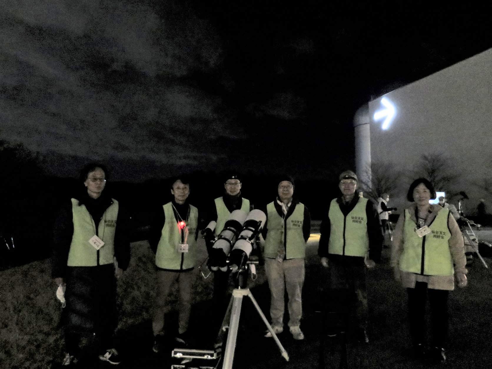 屈折望遠鏡2台、大型双眼鏡を3人で操作、呼び込み等のサポート3名、途中まで+1名の計7名での対応です。