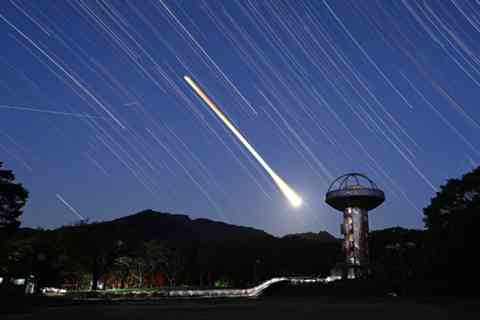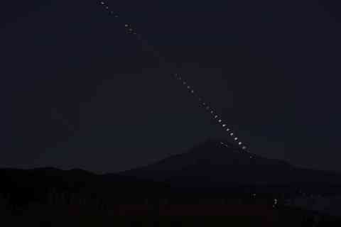 風景は月没後に撮影し、明るさを落としたものを比較明合成している。