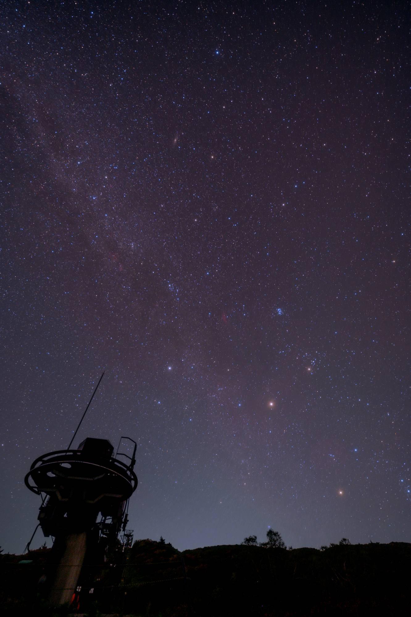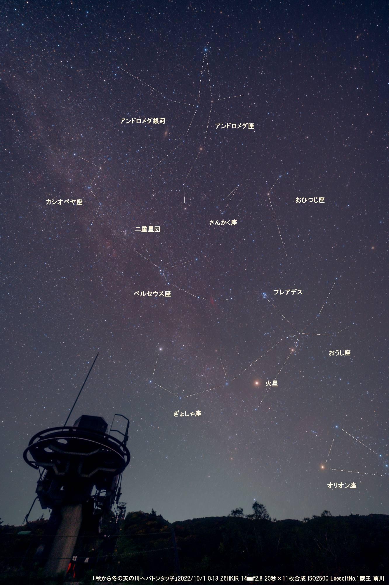 秋の星座が瞬く星空に,日付が変わる頃東の空には冬の天の川に沿って冬の星座が昇っています。