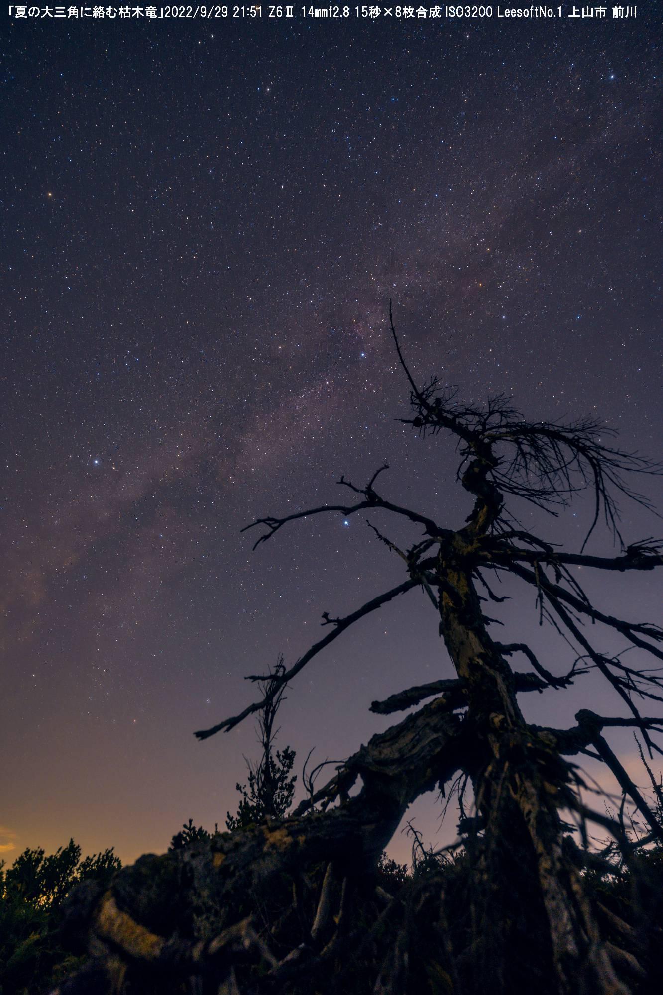 山形蔵王に枯木を見つけました。アオモリトドマツかな?風雪に耐えた幹をさらしている姿に思わず枯木大王と名付け,撮影しました。夏の大三角に絡んで,食べてしまいそうな竜に見えたので,それが分かるようにフレーミングしました。皆さんは,どのように感じますか?