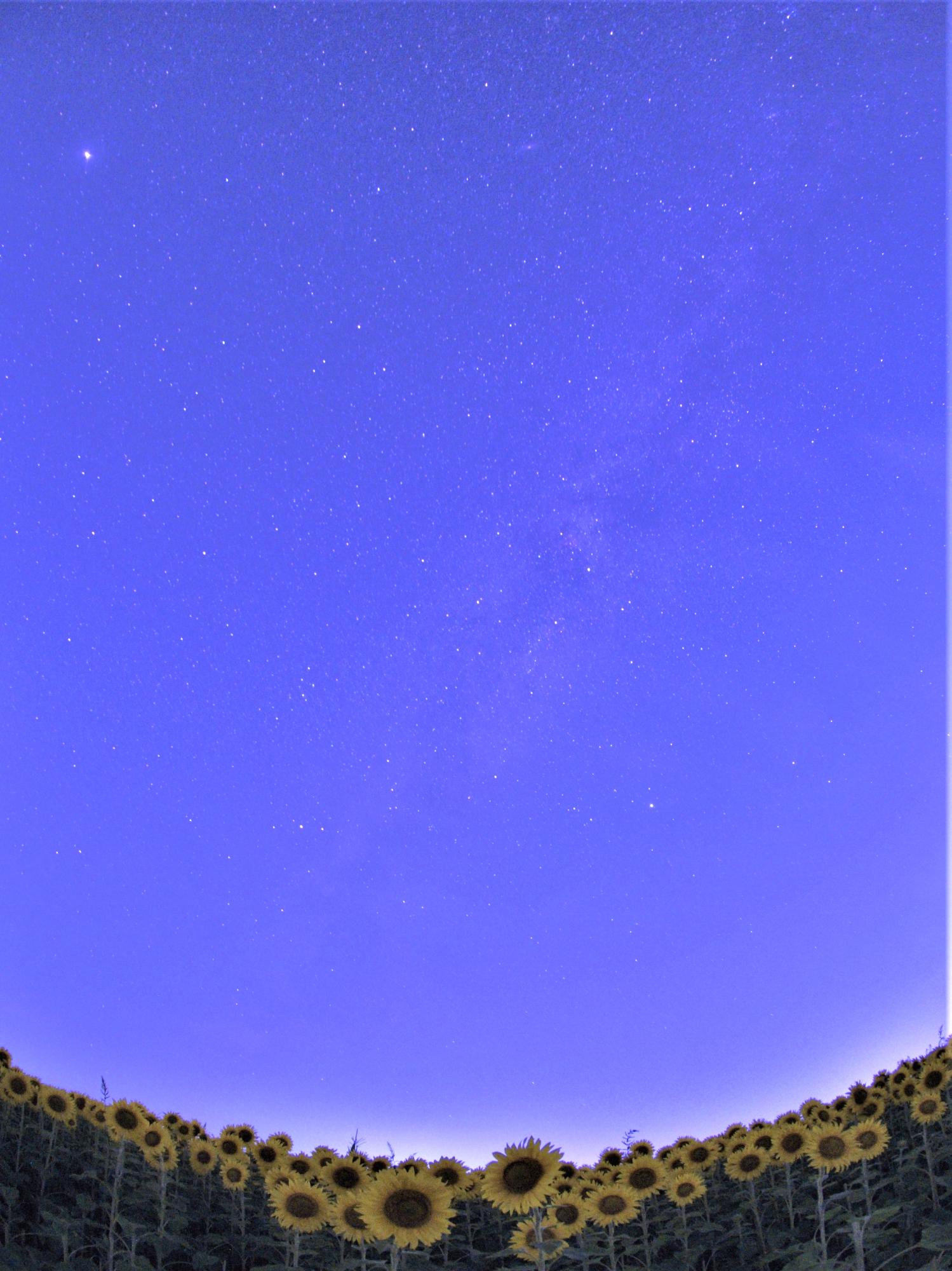 毎年行っている山元町のヒマワリ畑。今年も行ってきました。出会いは夜。晴れるかどうか分からないままに,夜になってからゆっくり出発。おかげで,霞がかかった天の川とヒマワリ畑に出会えました。日の出前に終えて終えて,天の川観察会に集まった,ヒマワリたちとおしゃべりして帰りました。