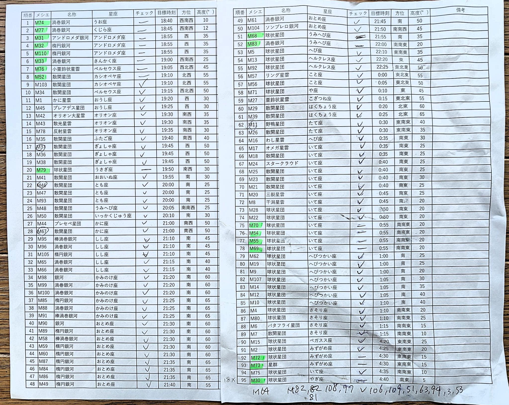自分のメシエマラソン結果は緑マーキングの18天体が木立や低空の雲で確認ができませんでしたが初戦にしては満足感いっぱいです。