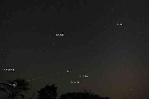 > その空の撮影後半、03:50北東の方向の林に斜めに飛行する火球を目にしました。林の中を進んでいるうちに後半は金星3個分くらいの明るさになり消えていきました。うしかい座からヘルクレス座まで約35度を超える火球でした。私のカメラの1台がほとんど全体の経路をとらえていたのでご覧ください。