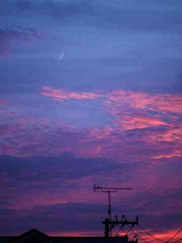 2025/07/27 庭の水遣りを終えると空一面夕焼け色に染まっていました。西の空を見ると薄雲の隙間から二日月を確認、慌ててカメラを引っ張り出して撮影しました。色が薄くなり始めましたが、見事な夕焼けと月の共演に畑仕事の疲れを忘れていました。200ミリf2.8 1/320秒