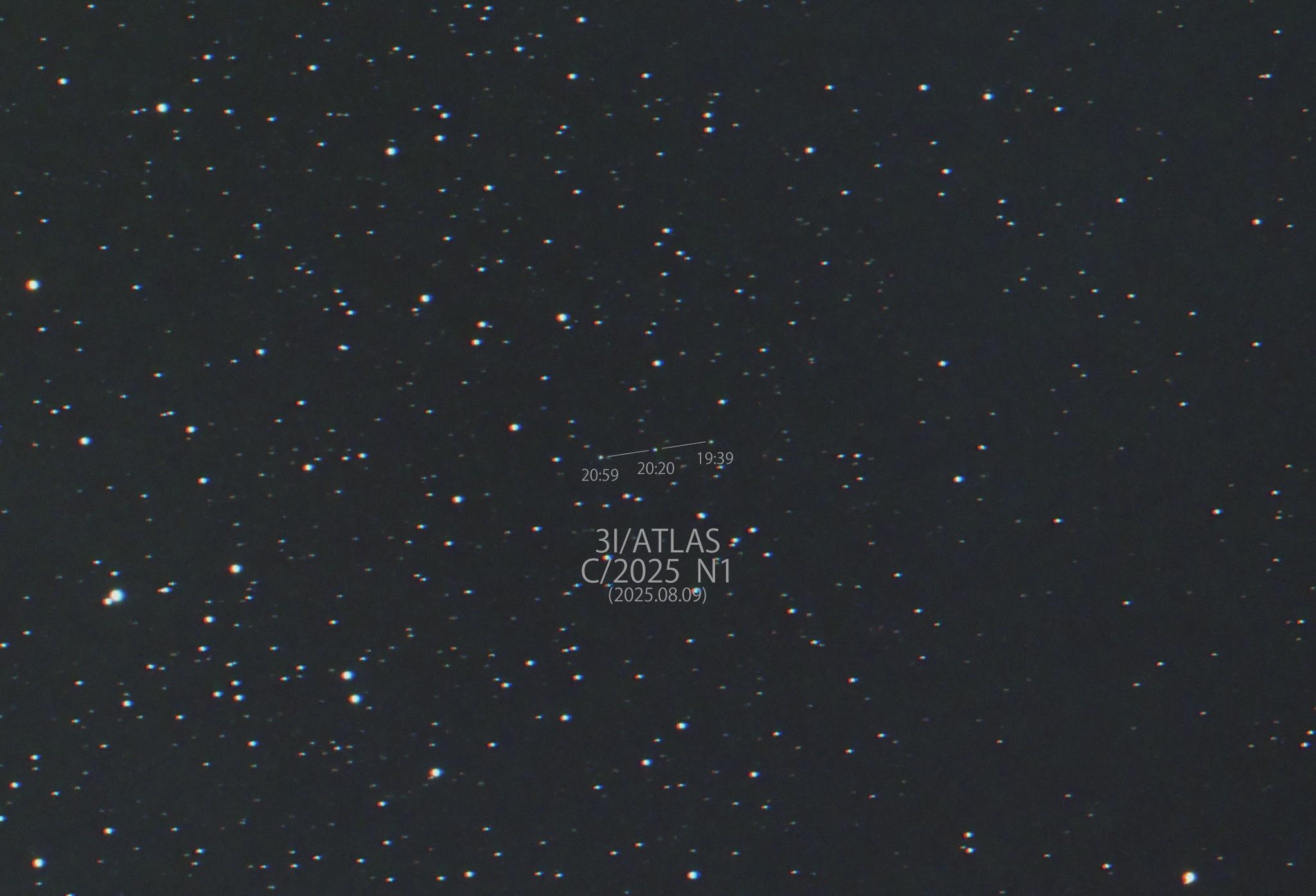 先月発見された恒星間天体3I/ATLAS彗星(C2025 N1)を8月9日にオーストラリアの口径50cm望遠鏡で撮影してみました。約40分おきにRGB各1分で撮影したものを重ね合わせした写真なのですが非常に高速で移動していることが判ります。太陽系外から飛来する恒星間天体はオウムアムア、ボリソフ彗星についで3つ目だと記憶しています。ハッブル宇宙望遠鏡では僅かな尾も観測されているようなので次回挑戦してみます。