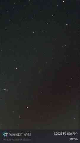 昨晩、阿武隈川河口にてSeestarにてスワン彗星撮影してみましたが、ご覧の通り星雲状のものがボンヤリと見える程度でした。