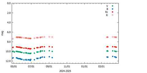一晩の観測を点一つで示していますが,昨夜の例として23時から3時までB,V,Rc,Icのフィルターでそれぞれ約40枚撮影し平均しています。