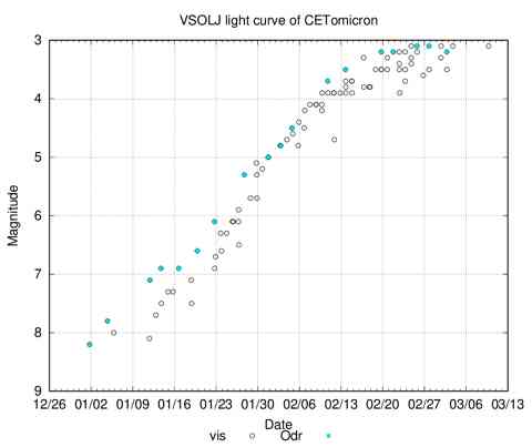 ミラですが、2等台には達しなかったようです。今年に入ってからの光度曲線(VSOLJのサイトで作成、青丸が私の目測)だと、ぎりぎり3等台で止まった感じですね。2月頃からの目測値がかなり分散していますが、おそらくミラが比較星よりもかなり低空になったから(高度差は10度位)と思われます。こうなると、結構目測は難しいですね。