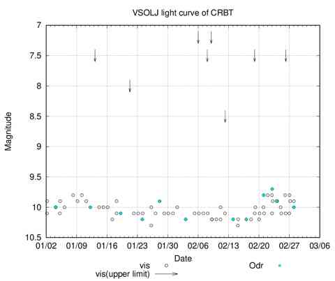昨年来話題にしているかんむり座Tですが、そろそろと言われながらまだ爆発しておりません。2025年になってからの眼視光度の光度曲線をVSOLJのサイトで作成してみました。まだ10等前後をうろうろ状態です。ただ、スペクトルを観測している外国の方のレポートでは、水素の輝線に変動が見られて居るようです。主星から流れ込むガスが形成する伴星(白色矮星)の周囲の降着円盤が高温になって来て居るとの話も。さて、どうなるでしょうか?
