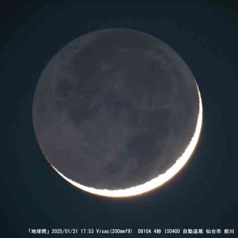2025/01/31 夕方地平線まで快晴の空、明日の土星食のテスト撮影をしました。月齢1.8の月です。地球照がはっきり見えました。