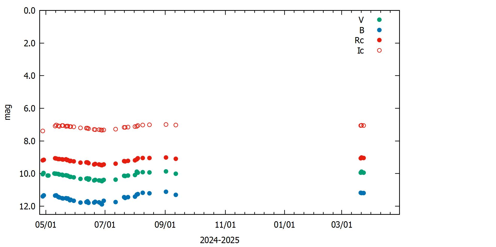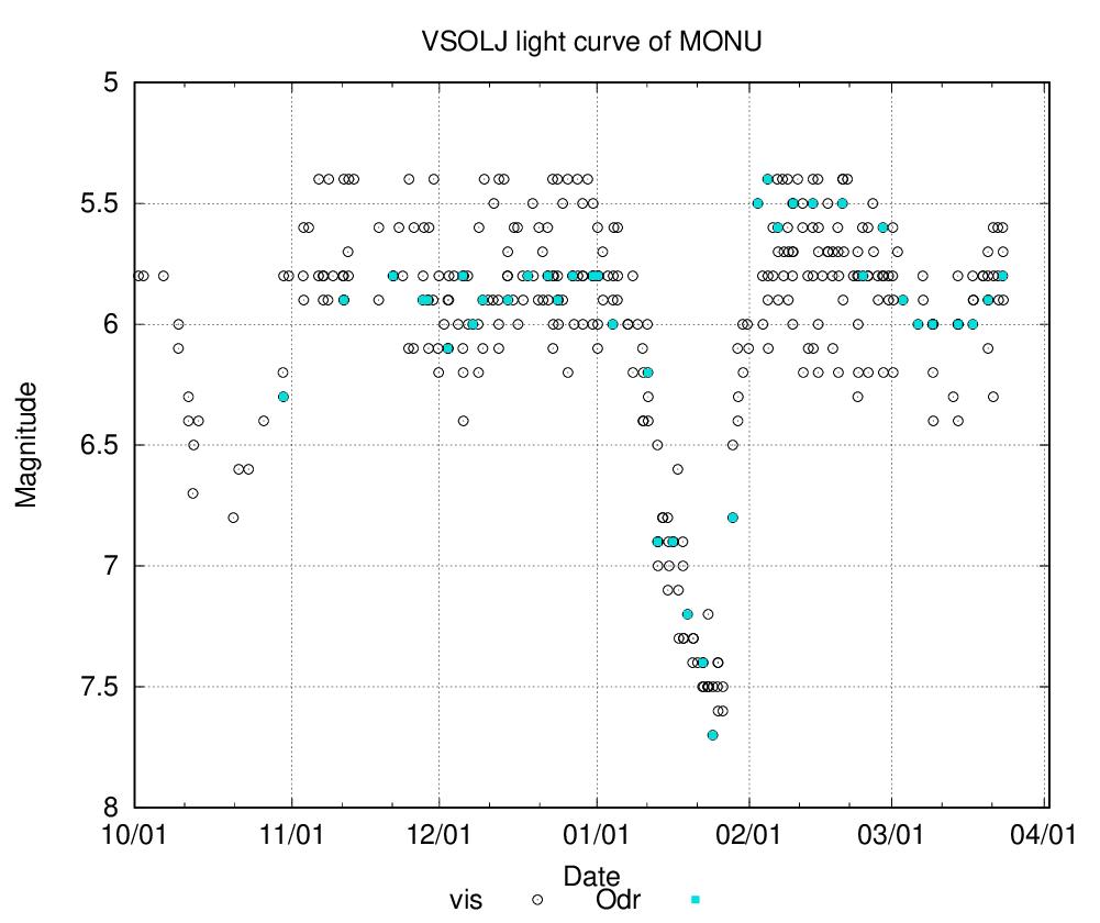 まだ観望の好機が続いている「いっかくじゅう座U」の光度曲線をVSOLJのサイトで作成しました。青丸は私の観測結果です。1月下旬に7.6等付近まで一気に暗くなり、その後は復光しています。今期は、フタコブラクダ型の光度曲線になりそうな気配です。4月初旬から中旬に明るくなりその後また暗くなると思われますが、観測は4月下旬が限界になるので、次の主極小までは観測可能かも知れません。4月下旬からは夏の変光星の観測時期になります。U Monの光度曲線の投稿はこれが最後になります。