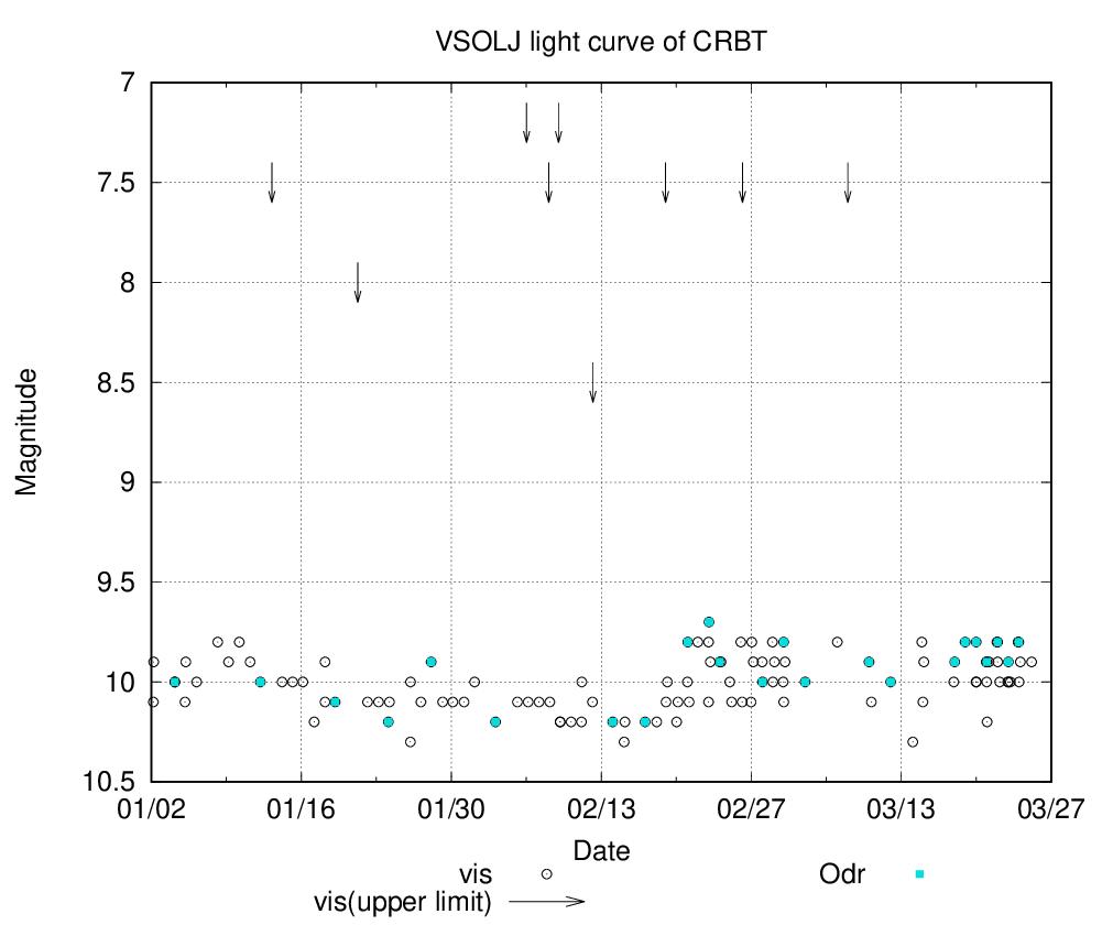 なかなか爆発しませんね。3月27日・・という予言(?)をした外国の研究者の方がおられますが、あと2日。ちょっと無理そうです。今年に入ってからの眼視での光度曲線(vsoljのサイトで作成、青丸は私のデータ)はこんな感じ。最近、やや明るい状態が続いている感じはします。Hアルファ線の強度と線幅が広くなっている・・というスペクトル観測の報告が相次いでいますが、それとの関連性は?です。
