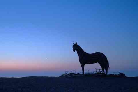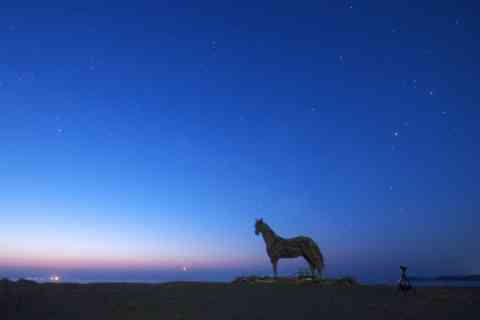> 2 さそり座とわし座に挟まれて、月齢27.1の月の出を馬のオブジェが待っていると、天の川の光を掻き消しながらやっと細い月が登ってきました。