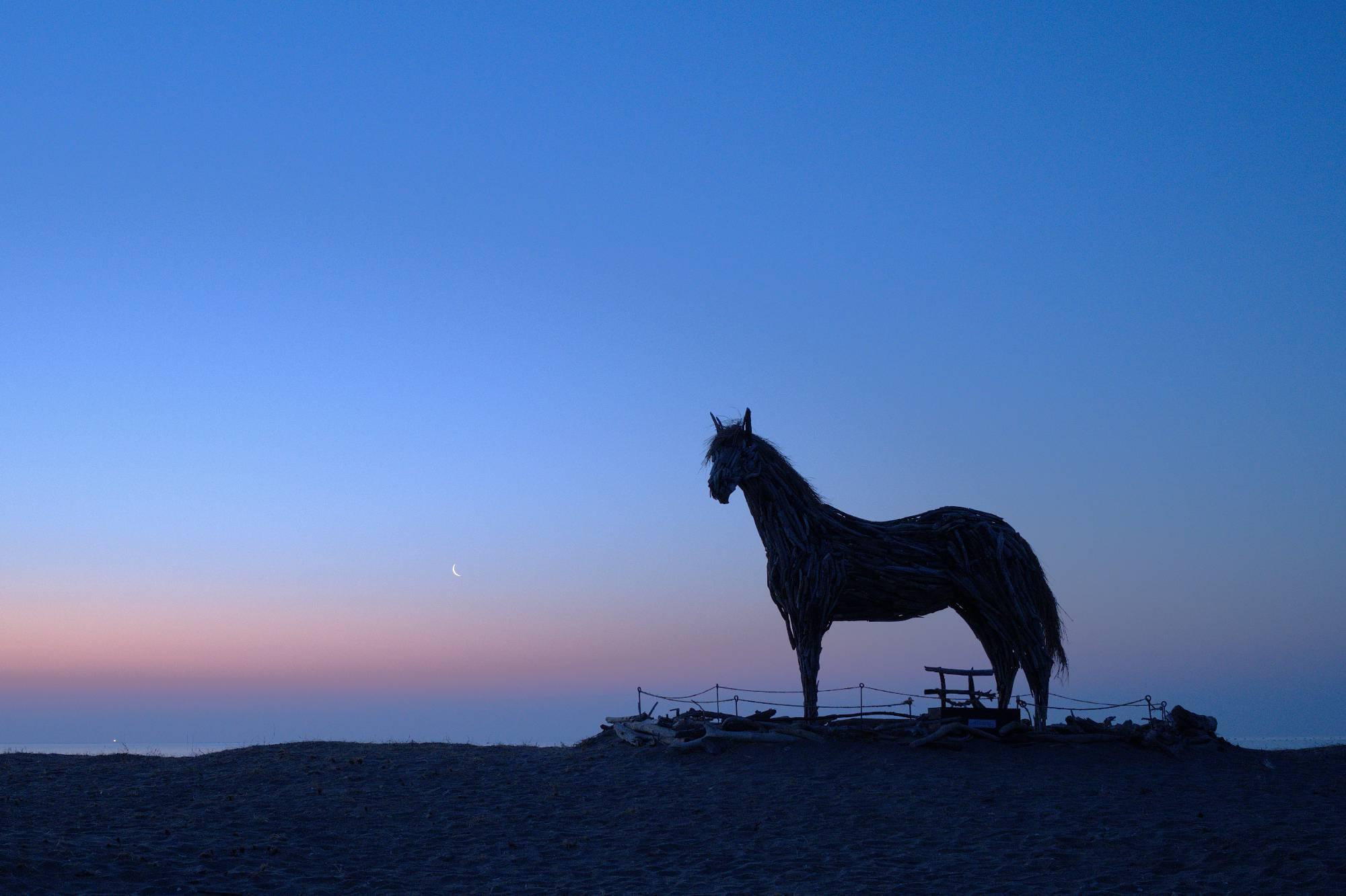 > 1 早朝の月齢27.1の月の出を待つ馬、何を話しているのだろう?