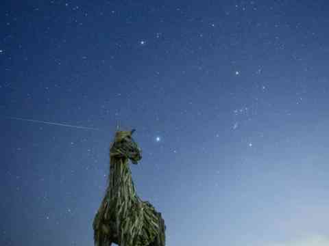 2 さそり座とわし座に挟まれて、月齢27.1の月の出を馬のオブジェが待っていると、天の川の光を掻き消しながらやっと細い月が登ってきました。