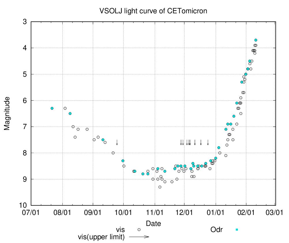 ミラがぐんぐん明るくなり、3等台に突入しました。VSOLJのサイトで作成した去年7月からの光度曲線(青が私の目測)を添付します。今年の1月から1ヶ月半で5等級も明るくなりました。3センチの双眼鏡で夕暮れの空でも確認できます。