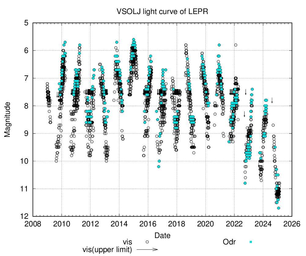 うさぎ座Rは、別名クリムゾンスターとも呼ばれている赤い星です。炭素星と呼ばれる分類の恒星で、恒星大気中に炭素が多く含まれている事で短波長成分が吸収され、その結果赤く見えているのです。ミラ型の変光星としても有名で、最近、このRがかなり暗くなっている事が報告されており、私の観測でも10等台から11等前半程度でした。周期は445日となっているのですが、さらに長い40年ほどの周期もあると言われています。つまり二重周期を持っているわけです。このグラフは2009年末から現在までのうさぎ座Rの光度曲線をVSOLJのサイトでプロットしてもので、青い点は私の観測データです。確かに、2年ほど前から暗くなっていますね。さて、どこまで暗くなるでしょうか?