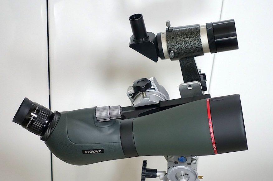 観測には8cmや8.5cmのアポ屈折を使う事が多いのですが、それなりに準備をしないといけないので、短時間で手軽に観測したい時にはSVBONY社のフィールドスコープ(SV406P)を使っていました。ただ、付属のズームアイピースだと、最低倍率の20倍の時の実視界が2度しかなく、観測にも観望にも向いて居ないので、アイピースをUF18mmに変えたのがこの機材です。倍率は24倍、実視界2.7度となり、8等台後半の星まで見えるので便利になりました。もう少し倍率が欲しい時には、同じくSVBONY社のUF10mmにすると、倍率が43倍、実視界が1.4度ほどになり、RFTとしても機能します。ただし、45度の接眼部なので、高度が45度を超えると観望が苦しくなるのが欠点でしょうか。なお、導入用として5cmの正立ファインダーをアリガタプレートに同架して使っています。