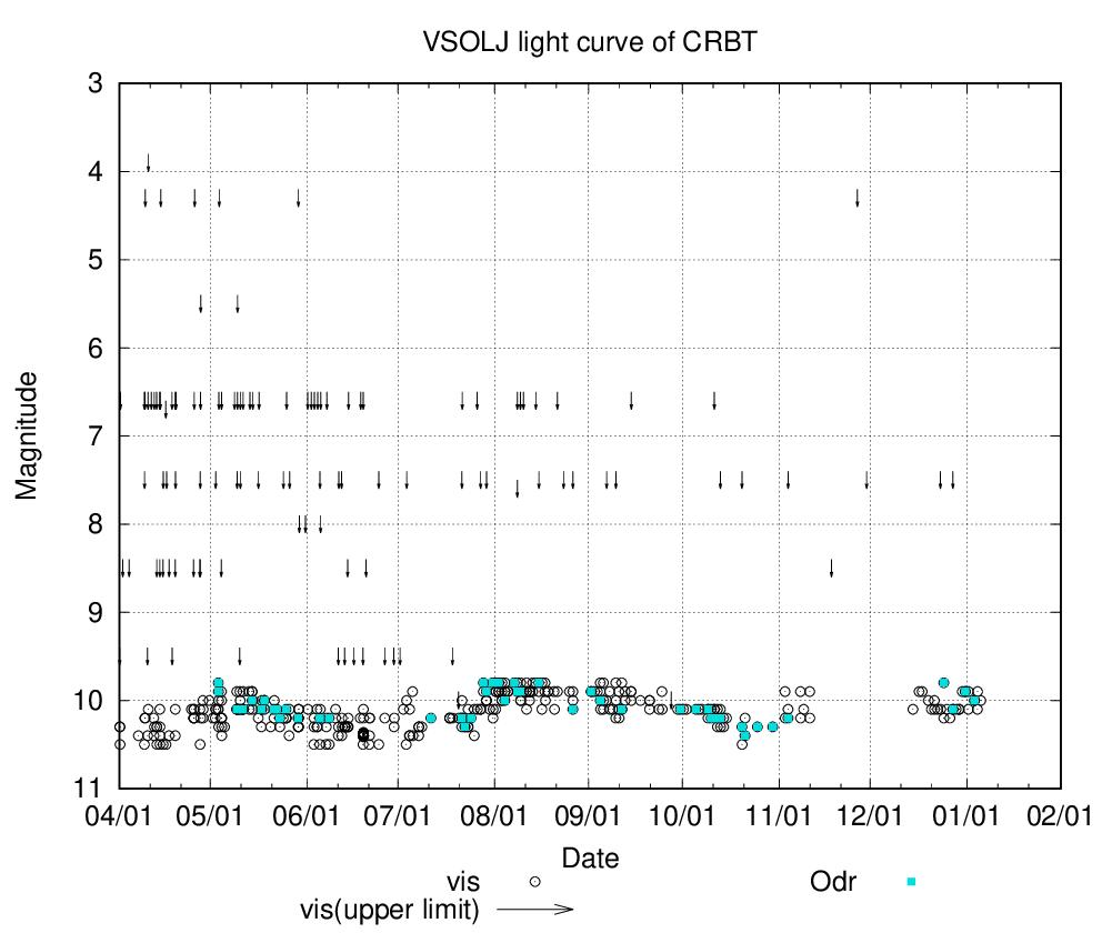 昨年から爆発の可能性が指摘されているかんむり座Tの今月までの光度曲線(眼視観測のみ)をVSOLJのサイトで作成しました。例によって青丸が私の観測データ(主に8cm, F7屈折を使用)です。今月に入っても10等付近をうろうろしています。American Astronomical Societyのジャーナルでは、爆発時期の可能性として25年の3月27日ごろか、25年の11月10日、26年の6月25日、27年の2月8日といった論文も出ていますが、さて、どうなるでしょうか?過去の記録から、爆発すれば2等台は確実らしいので、期待したいところです。