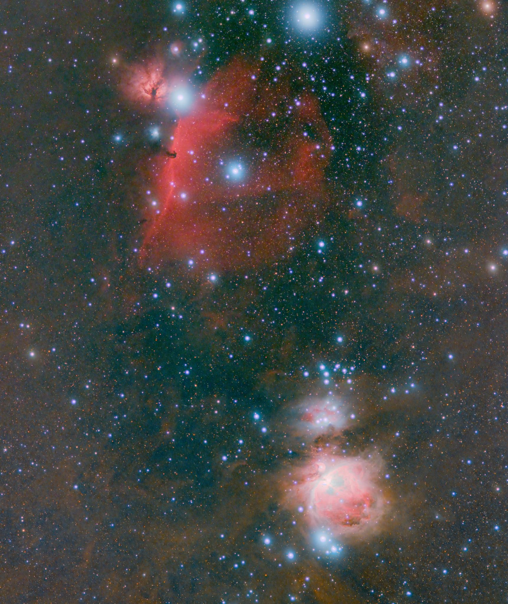 庭先から、焦点距離180mmの屈折鏡筒で、馬頭星雲とオリオン大星雲を狙ってみました。