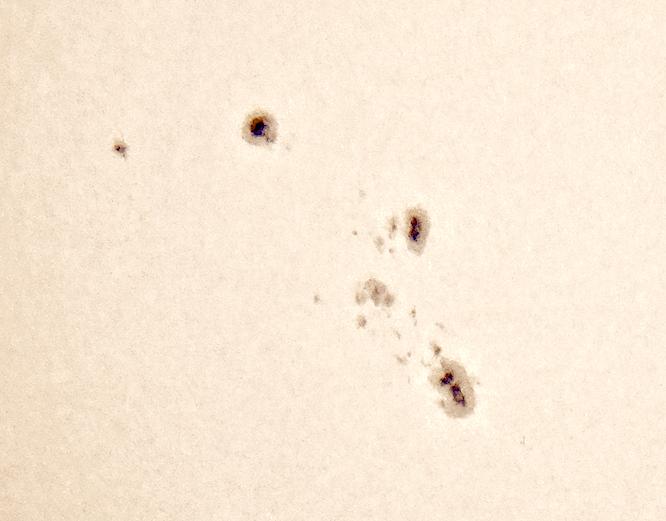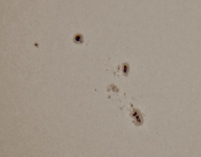 比較的大きな黒点が出ていたので、TV-85&SVBONY 7.2mm-21.6mmズームにコンデジ手持ちコリメートで撮影してみました。太陽活動が活動期に入ったので、今後も大きな黒点が出そうですね。フィルターはバーダープラネタリウムのソーラーセイフティーフィルムです。