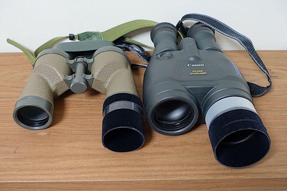マンションのバルコニーで変光星を観測していますが、なにせ市街地のど真ん中なので南側にはマンションなどがあり、対物レンズむき出しの(?)双眼鏡にはもろにそれらの光が入ります。場合によっては、視野が明るくなってしまうので、フードが必要になります。左は4センチ用、右は5センチ防振双眼鏡用のフード(ハクバのメタルフード+自作フード)で、クリヤホルダーをカットして丸めて内側に植毛紙を貼った構造です。4センチで45ミリ、5センチで60ミリほどの長さになっており、対物レンズに斜めから入射する環境光をかなり低減できています。