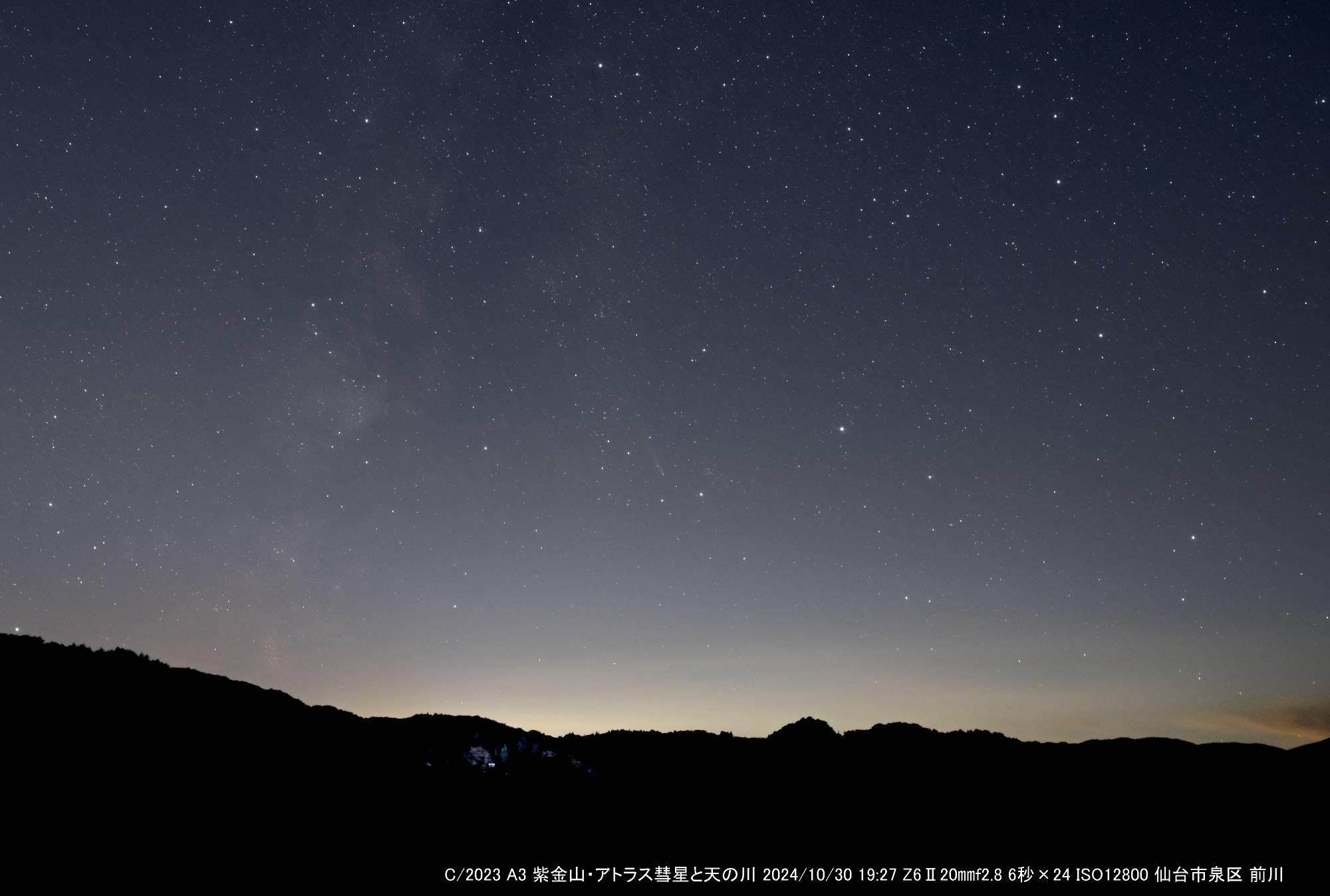 10月30日は前日からの雨が上がり、低気圧の発達により風が強い一日でした。空模様は午後から晴れ上がり、夕方の彗星観測に障害となるものは風だけでした。そこで、今回は風の影響を受けやすい望遠鏡での撮影は諦め、カメラでの広角撮影、望遠撮影に絞って観測をしました。目測では、全光度4.5等と思われます。広角レンズの焦点距離はズームを使20㎜にて、望遠レンズは同じくズームを使い200㎜で撮影しています。広角レンズ画像は彗星が小さく写っていますので、拡大して探してみると見つけやすいと思います。