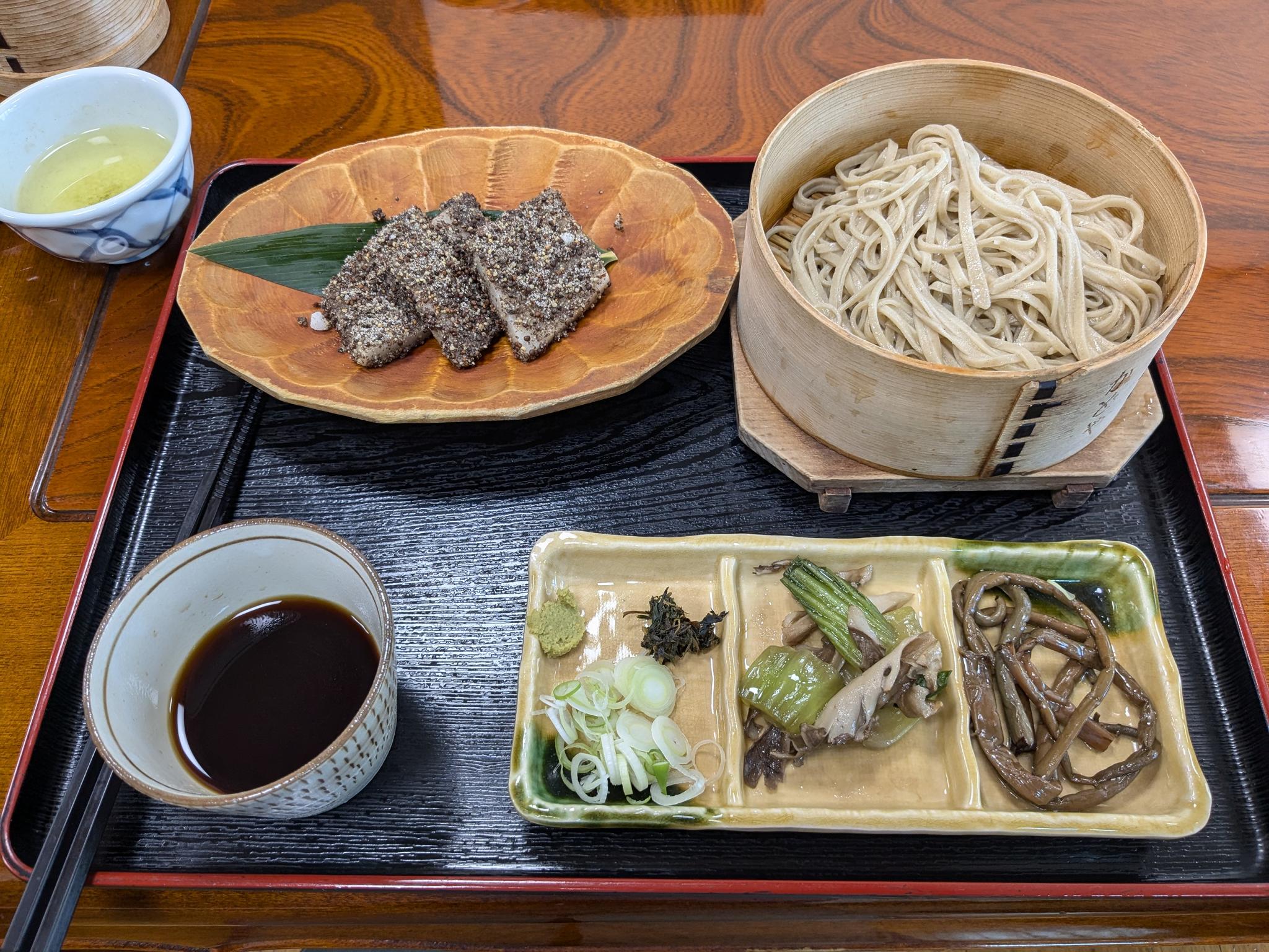 2日目はみんなでミニ尾瀬まで行って、その手前の蕎麦屋さんで蕎麦をいただきました。右上の餅のようなものは、そば粉と米粉で出来ている「はっとう」という地元料理で江戸時代に美味しすぎて食べ過ぎないよう禁止(ごはっと)となったとのことです。