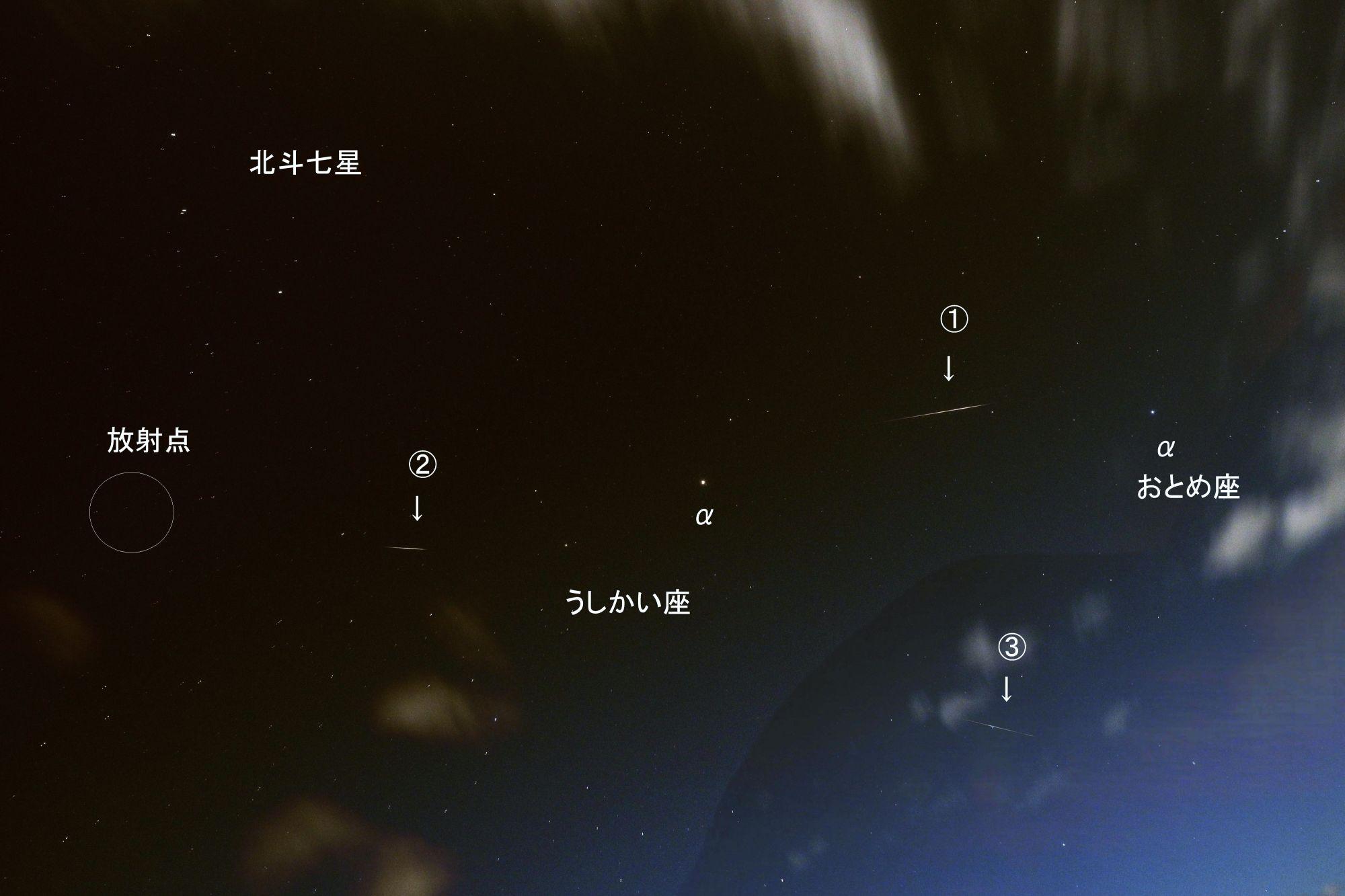 ふたご群の写真では、流星の場所が分かりにくいという声にお応えして流星に番号を振り、データも書き加えます。流星の写った3コマを比較明合成しました。急ぎの画像処理でお見苦しい点はご了承ください。
