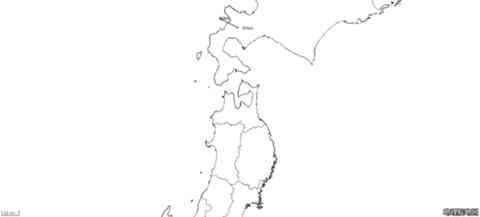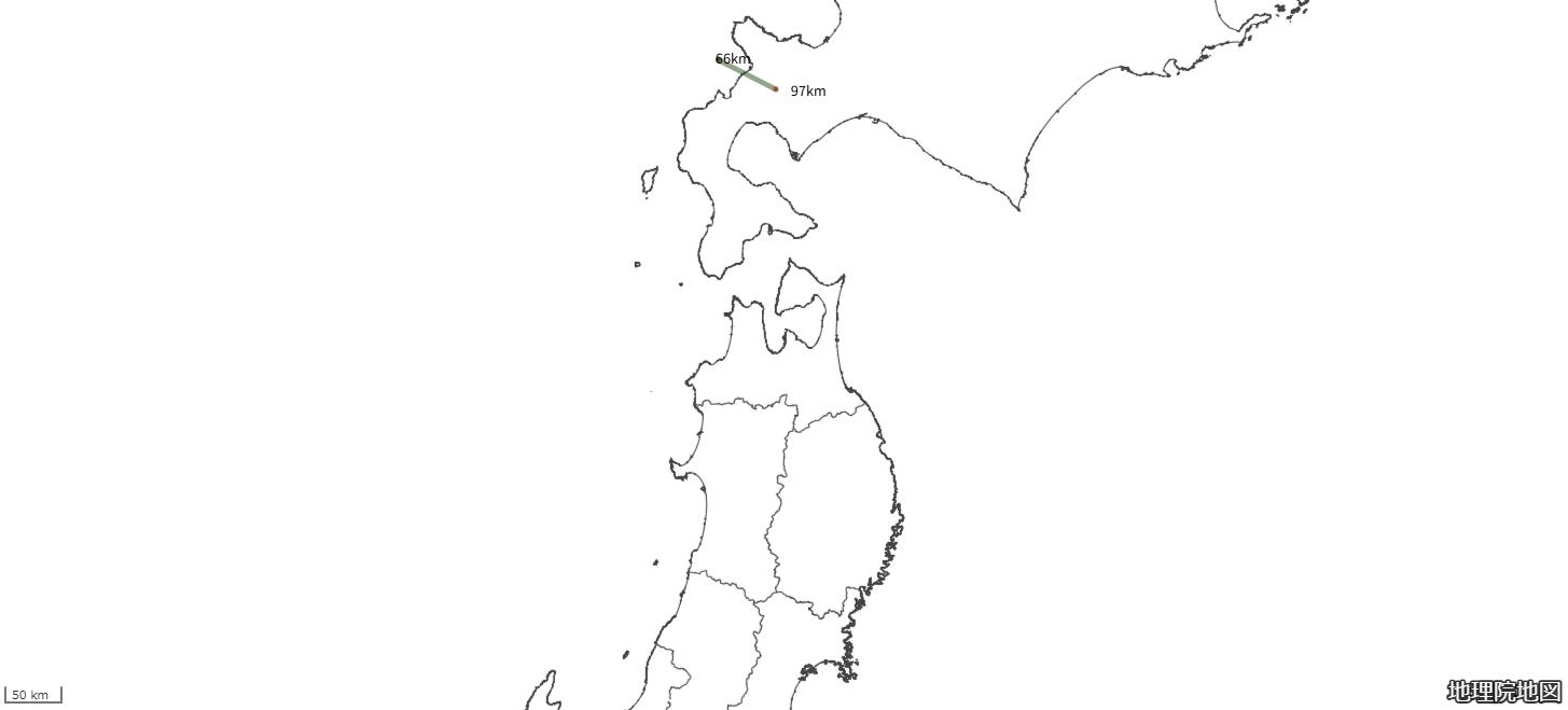 経路を求めたところ北海道の積丹半島付近で赤丸が発光点で高度97km,黒丸が消滅点で66kmでした。