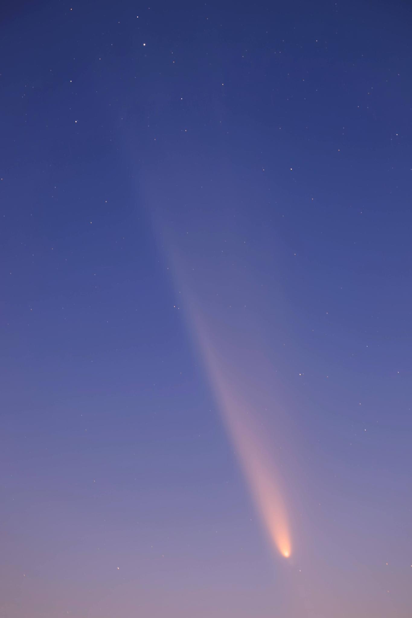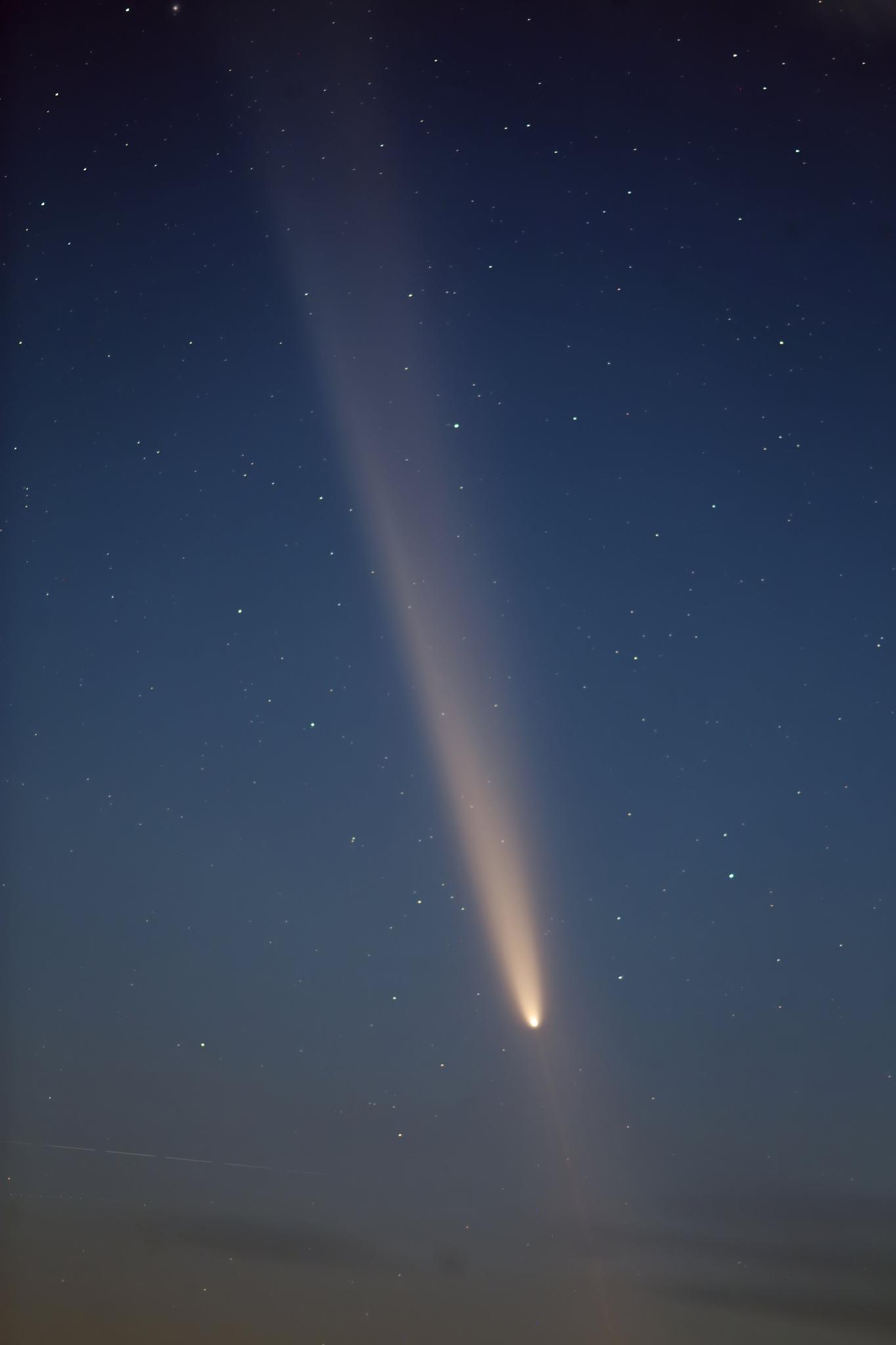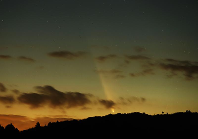 尾が長く見えて、肉眼では6~7度の長さがあり、撮影すると10度くらいまで伸びている様子が分かります。光度は前日と同じ程度と思います。今日は透明度の高い空だったので、昨日よりはっきり水平線に沈んでいく彗星を堪能しました。