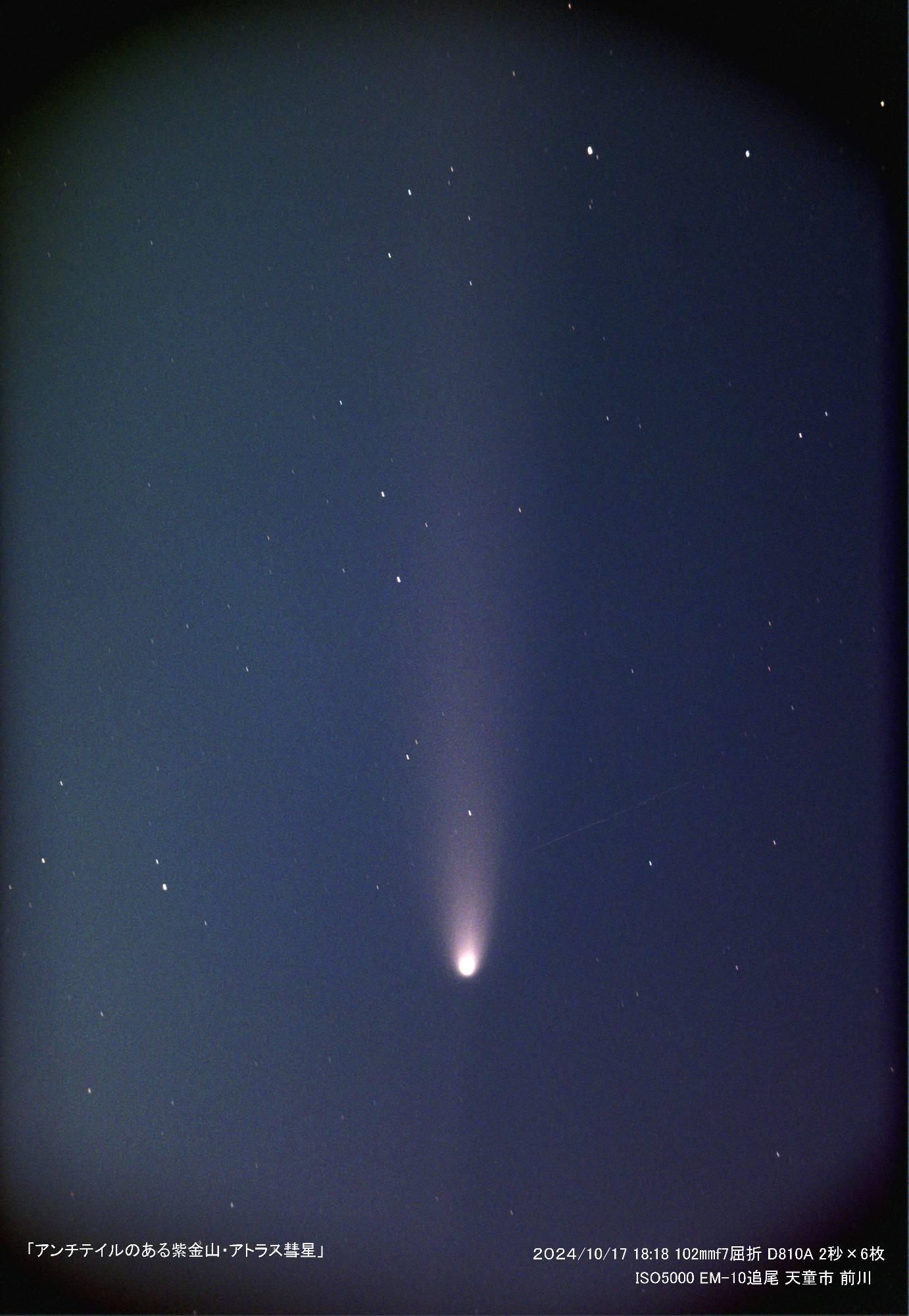 こちらはアンチテイルではないでしょうか?ダストテイルは、拡がり方によっては太陽側に伸びて見えることがあります。イオンテイル(プラズマテイル)は太陽風に流されて見えるので、必ず太陽と反対方向に延びます。紫金山・アトラス彗星はダストリッチな彗星ですね。