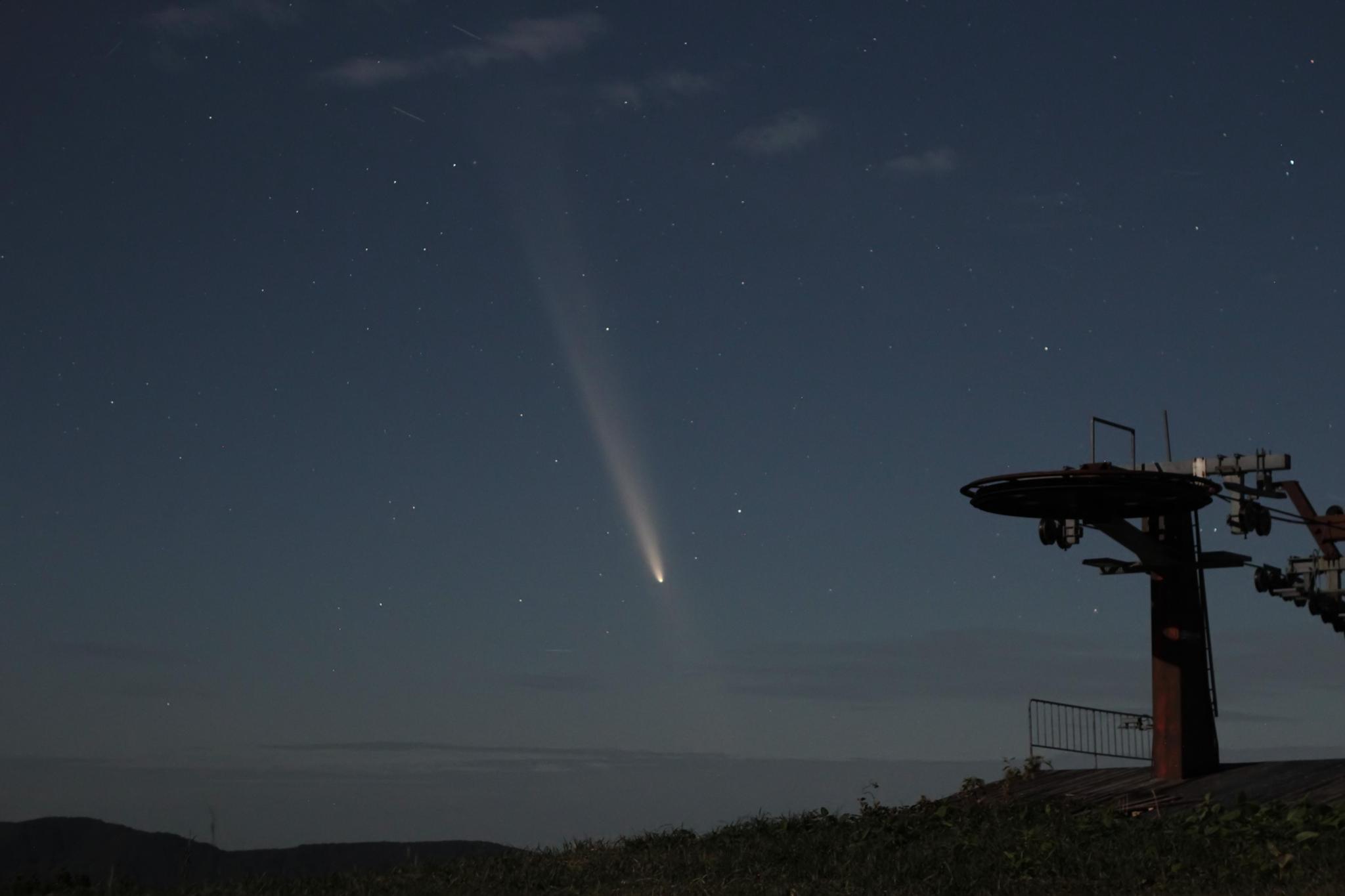 10月14日の彗星です。雲間を探して湯殿山まで遠征しました。200mm/EOS6Dは縦構図に収まりきらないくらいで視野7度の双眼鏡の視野からはみ出ていました。裸眼でもハッキリ見えてげんこつ一つ分(約10度)の尾が確認できました。