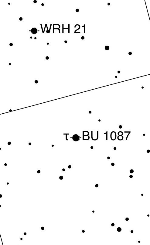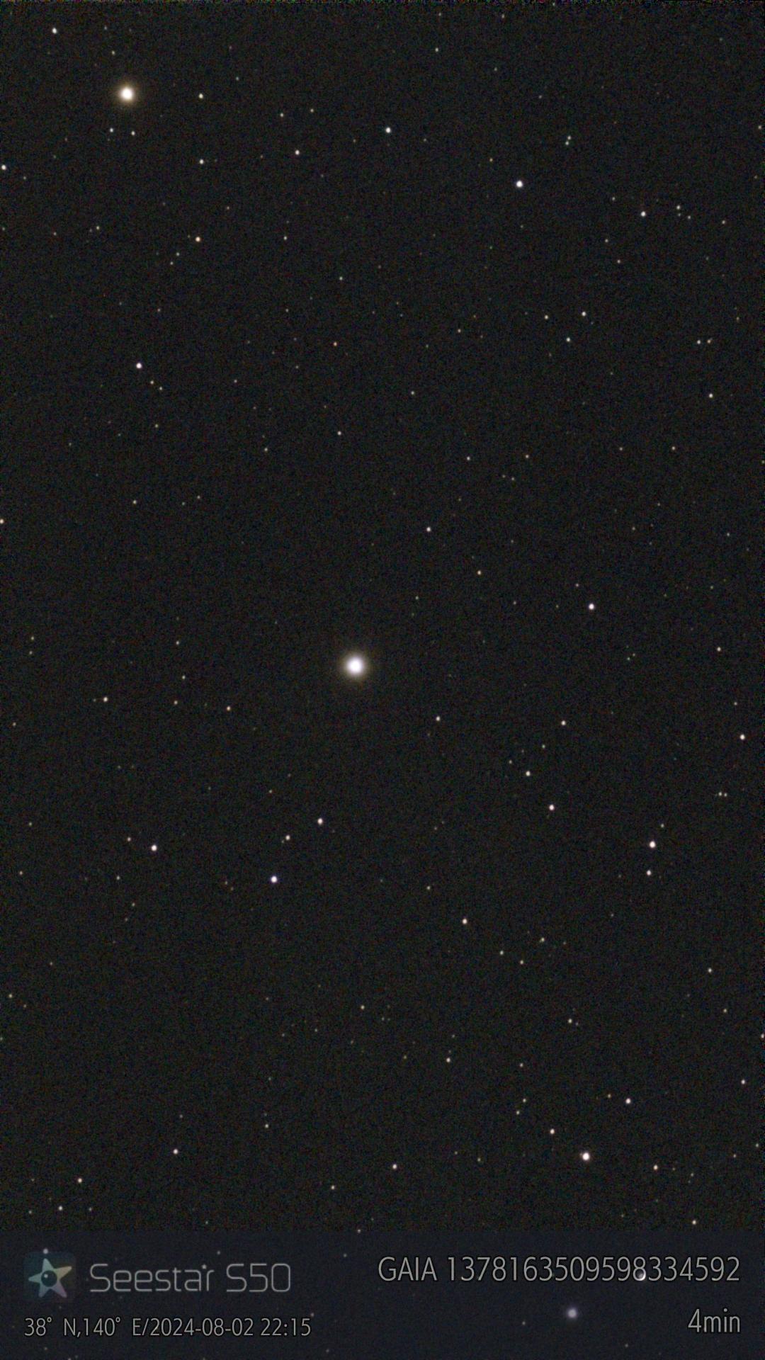 吉永君が撮影した星を確認しました。中心の明るい星は、T CrBではなくτ(タウ)CrBですね。写真の下に表示されているGAIA星表の番号から検索して見つけました。Skychartで検索して見つけたτCrBの星図を掲載します。吉永君の写真とほぼ同じ範囲になるように、星図から切り出しました。おそらく、吉永くんは「T」と入力したのですが、Seestarの方で勝手に「τ」と変換したのでしょう。