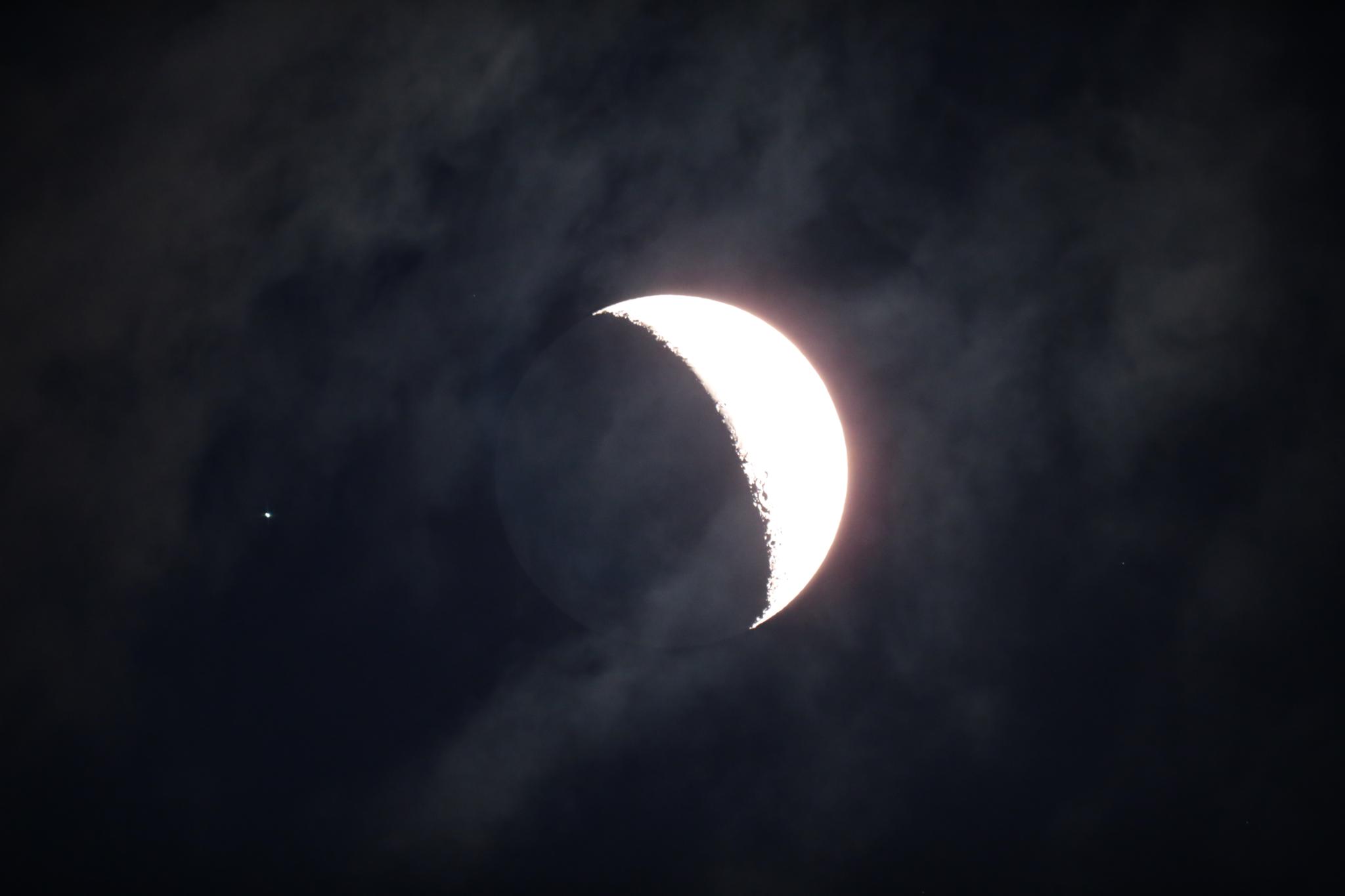 昨夜、1等星のスピカが月に隠れる現象が起こりました。しかも今回は仙台北部で月の淵のギリギリのところをスピカが通るという予想で遠征も計画していたのですが生憎の天気で自宅からのトライに変更。食の50分前には雲に切れ間が出てきて写真のような状態となり期待が増しました。