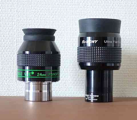 ふと思い立って、手持ちの廉価版の広角アイピースSVBONY SV190 UF18mm(見かけ視界 65度) と笠井トレーディングのアイピース・レデューサー(31.7mm, 0.75倍)を組み合わせてみました。結果は、ほぼ24mmの焦点距離になったのですが、視野周辺での糸巻き型の歪みがパンオプティック24mmよりもかなり少ないのです。価格は、パンオプティック24mmが現時点で60,500円、一方、UF18mm+31.7mmレデューサー(25mm延長筒がセットです)の合計価格は16,380円と、実に4倍近い価格差。ただし、レデューサーの枠があるため、後者のセットでは視野のエッジ付近で視野が暗くケラれている様ですし、視野中心から7割くらいから星像が徐々に崩れますが、UF18mm単体でも視野の中心から7割くらいから星像が徐々に崩れるので、これは仕方がないです。パンオプティックは視野のエッジでも星像の崩れはほどんどわかりません。さすがテレビュー・・・