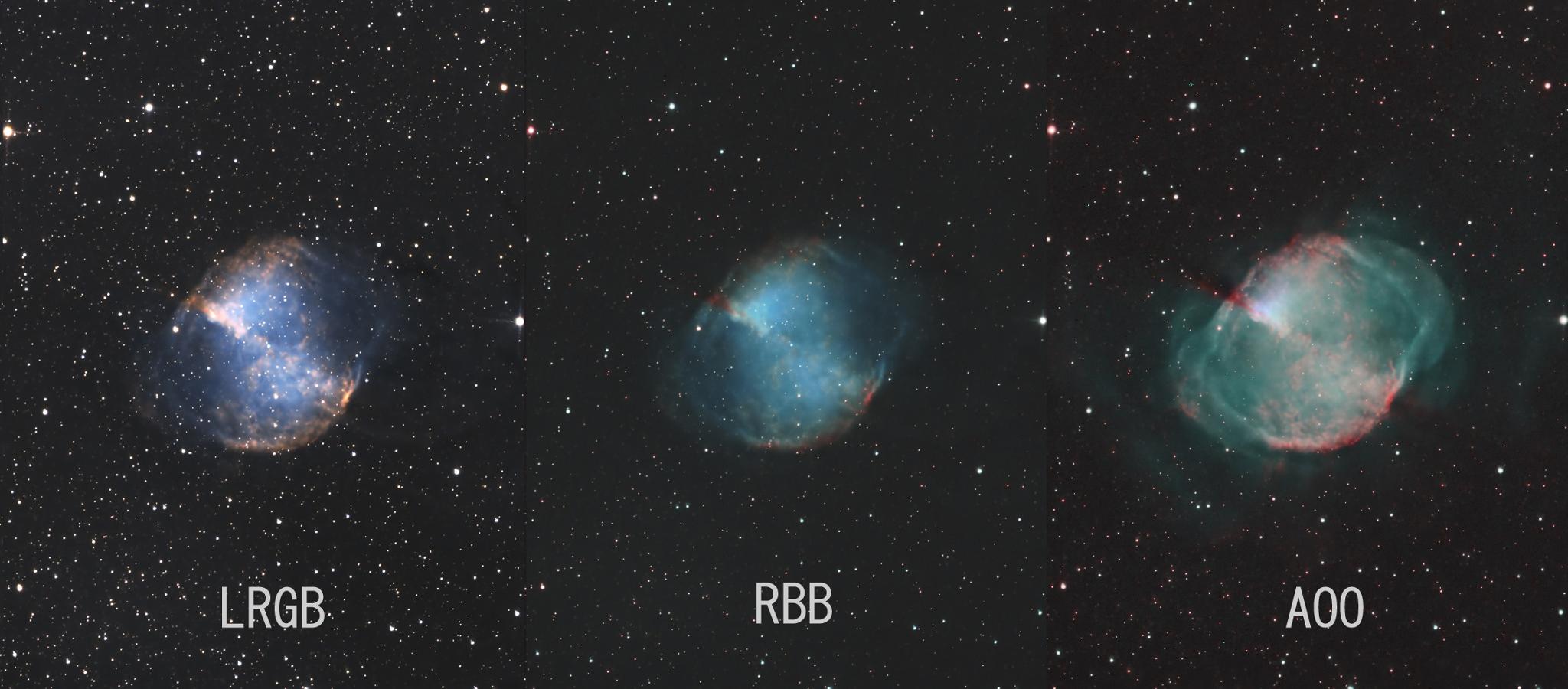 ②真ん中の画像は光害影響の大きいGの代わりにBを使用してカラー合成しました。本来のM27の色合いに近くなるようです。