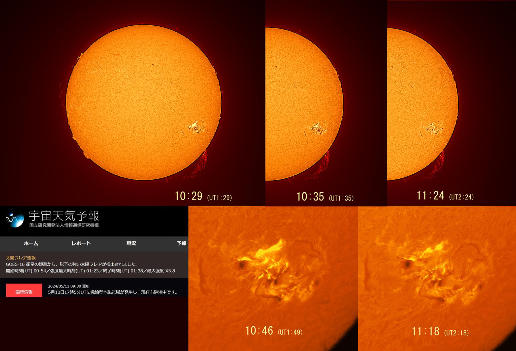 久しぶりに旧幹事長の太陽望遠鏡で太陽を撮影している最中に1982年のX5.9以来のX5.8クラスを運よく捉えました。右下の白い部分です。今回のフレアは40分程度継続したようですが、この写真は最大強度となった10:23から6分後の日本時間10:29のものです。