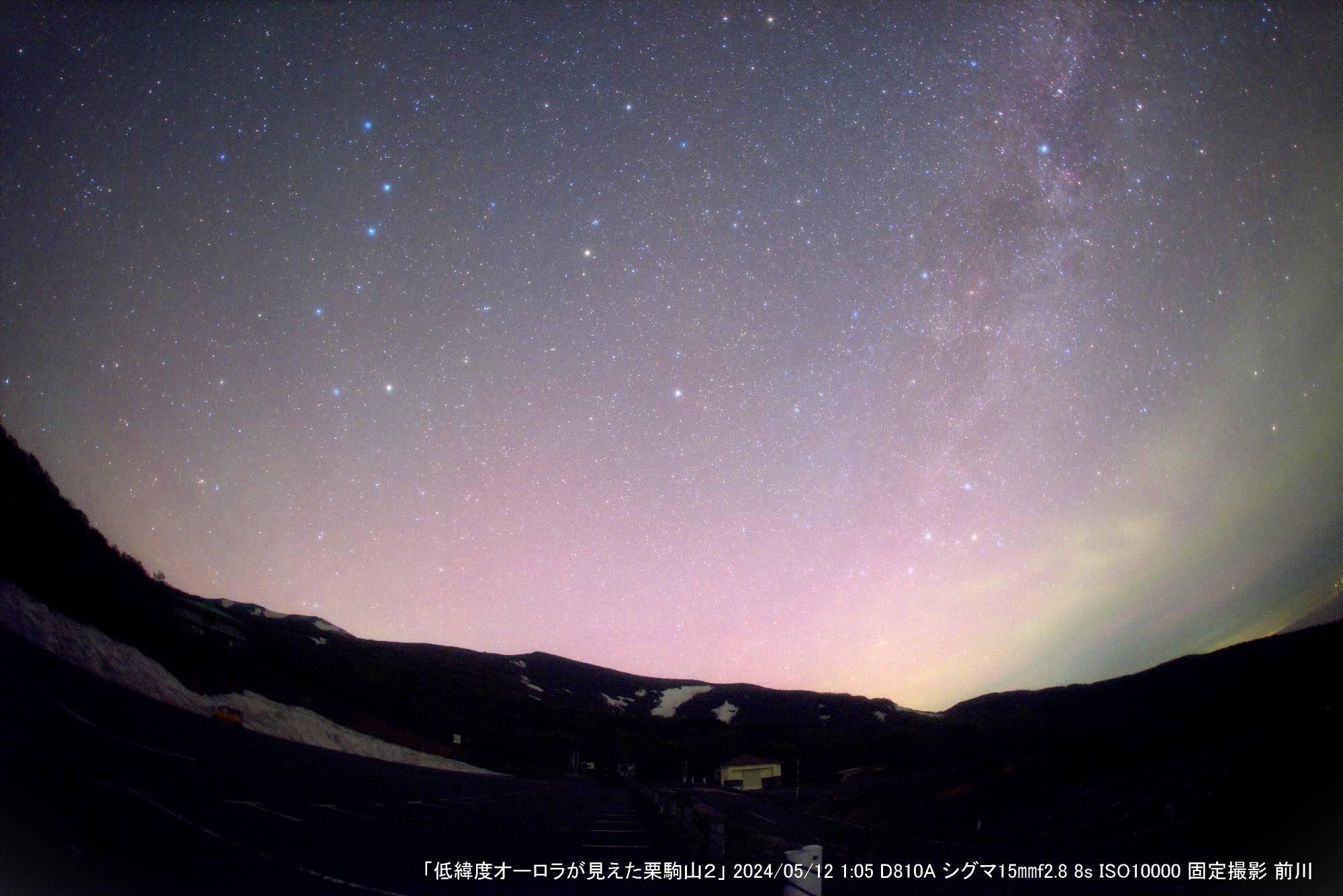 昨夜5月11日は同好会メンバー3人でいつもの南三陸町に行ってました。写真は23:47に撮影したもので左の明るい星が北極星、右の明るい星が白鳥座のデネブです。目でオーロラは確認できませんでしたが北天を試し撮りしたところいつもとは違う赤く空を写すことが出来ました。この撮影時にはオーロラと断定はできませんでしたがmaeさんがいわかがみ平で撮影したものと発生方向が同じなので間違いはないかと思います。オーロラの明るい部分は真北から30度ほど東寄りで高度は35度付近まで赤く写ってます。薄い黄緑は薄雲です。