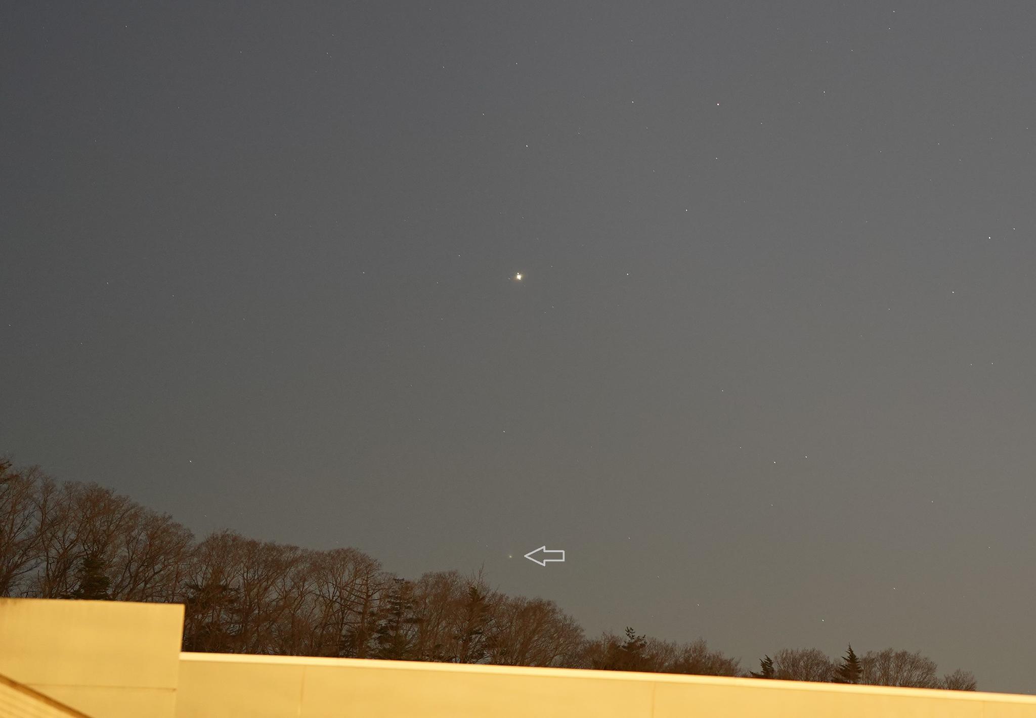 ポン・ブルックス彗星は木星と月齢1.7の月の間にあって、8倍42mm双眼鏡