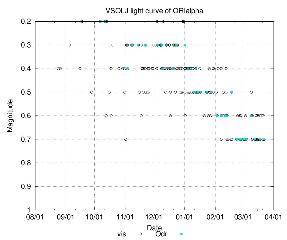 ベテルギウスですが、昨年から徐々に暗くなってはいますが、大減光になるかどうかは?な感じです。昨年10月からの眼視観測の光度曲線(Odrが私の目測)だと、0.2~0.3等級から、現在は0.7等級ほどになっていますね。2020年10月から翌21年の3月までも、0.4~0.7等級まで減光していますが、それと似た感じの減光ではないかと、個人的には思っています。