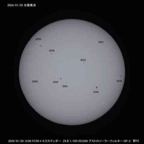 昨日の太陽黒点の様子です。賑やかな黒点群に太陽活動極大期の到来を感じています。