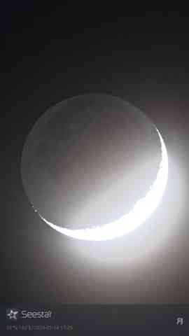 2024/1/14 どんと祭の帰り道、きれいな三日月を見ようと散歩に出ました。家と家のすき間から三日月を発見しました。望遠ズームレンズ230㎜で撮影しました。月齢2.9でした。