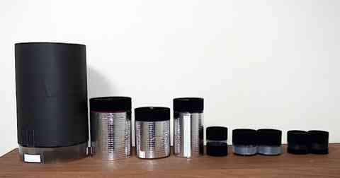 市街地にあるマンション7階のバルコニーで変光星を目測しているのですが、近隣のマンションや広告塔の照明などの光が鏡筒内に入射して視野が明るくなるのを防ぐために、遮光用フードを自作して使っています。左から、15cm, F5反射用(鏡筒内にも植毛紙を貼ってます)、8.5cm, F7アポ屈折用、8cmフィールドスコープ用、6cm, F6アポ屈折用、5cm正立ファインダー用、5cm防振双眼鏡用、そして4cm双眼鏡用です。反射用のフードは直径が約17cmほどです。フードはほぼ同じ構造で、クリヤホルダー必要サイズに切断して丸め、内側に国際光器で購入した植毛紙を貼ってあります。屈折用フードには、フードの放射冷却を少しでも抑えるためにダイソーの流し台シート(アルミ被覆+適度のクッション性材質)を貼っているのですが、このシートの効果は?ですね。